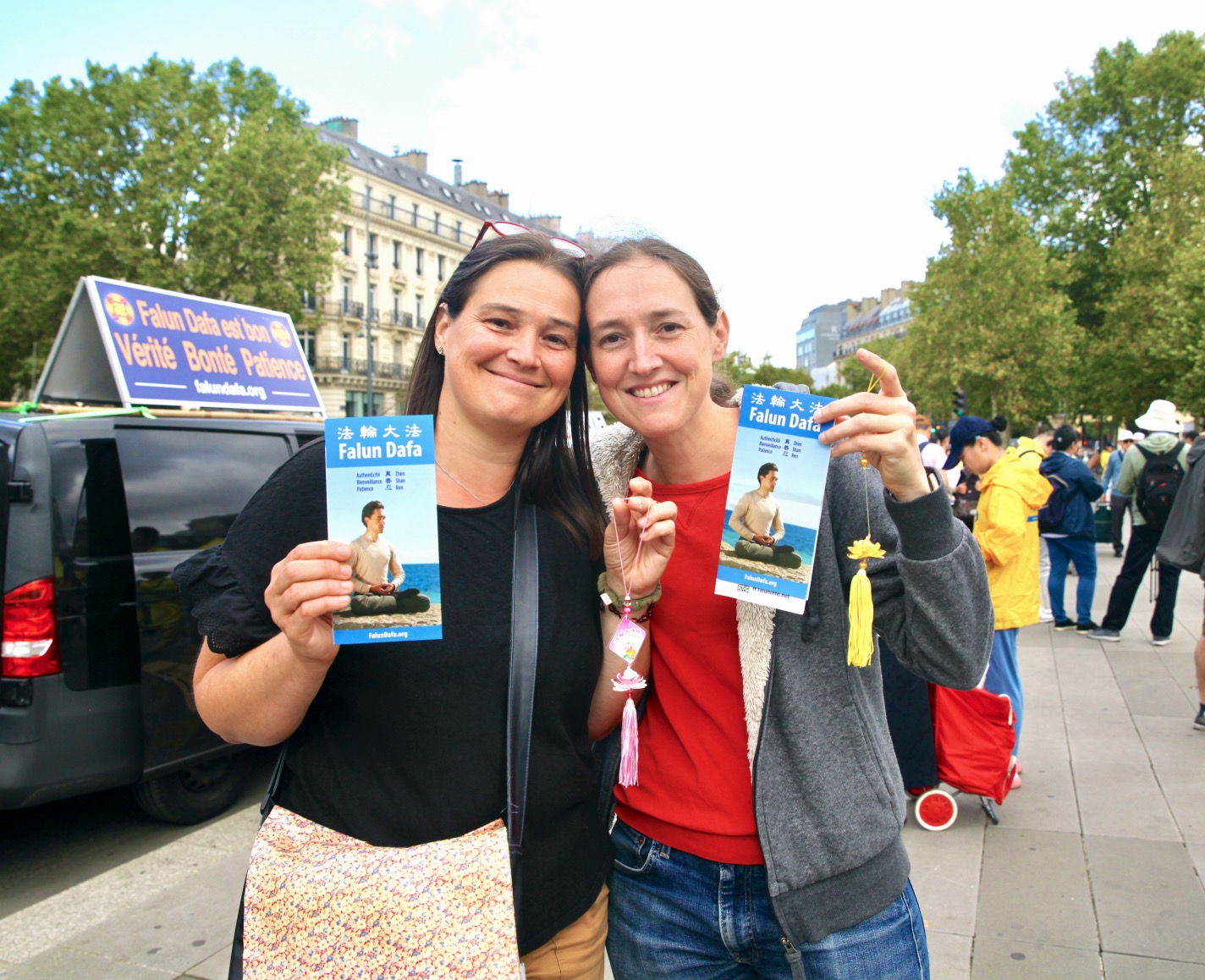 ![]() 图:法国医院职工玛丽(右)和朋友尤莉(右)支持法轮功学员和平反迫害。 |