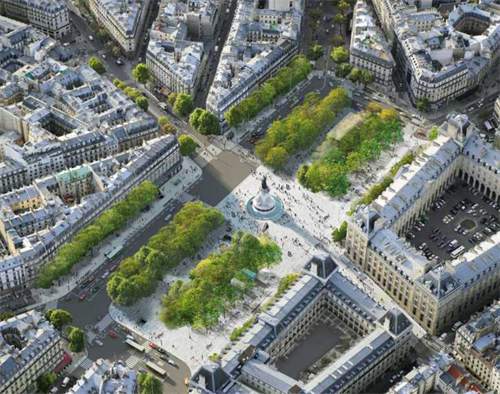 巴黎共和广场是巴黎著名广场之一,也是巴黎最大的公共步行广场,杜绝机动车驶入。上百颗高大的乔木形成广场纵向轴线,既有气势又将大面积的自然景观融入了广场设计。广场里有序的布置了水池、餐厅、长椅,方便行人享用。圣殿大道、圣马丁大道、伏尔泰大道、共和国大街、圣殿路、圣殿市郊路等等道路在此广场交汇。