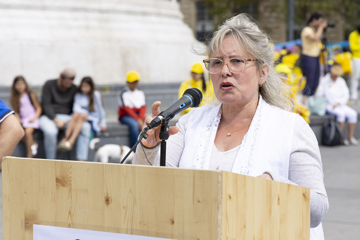 弗朗索瓦丝·霍斯塔利埃(Françoise Hostalier)女士是法国前教育部长和欧洲委员会法国代表团副团长,她对在场的民众高声说:“这里是自由广场,因此,我们要在这里维护中国人民的自由。人们应该可以有自由的思想,能够自由地生活,并能自由地修炼,而这些在中国是被(中共)禁止的。我们应该把这些罪行揭露出来。”