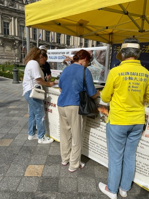 一位来自韩国的男子,五岁时被一图尔家庭收养。他花了很多时间阅读所有的展板,他看完了所有的内容,当他发现中共对法轮功学员施以酷刑并摘取器官时,他简直不敢相信。他逗留了很久,问了很多问题,并在请愿书上签了名。临走前他拿取了很多真相资料,准备告诉他的家人和朋友。