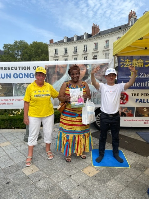 阿涅斯(Agnès)(中)来自加蓬,在图尔居住多年。“我本没打算今天来这里,是上帝派我来的。”她说:“你们是很棒的人,我想学习这种功法。我能感觉到你们的能量。”她打算从网上开始学习法轮功。