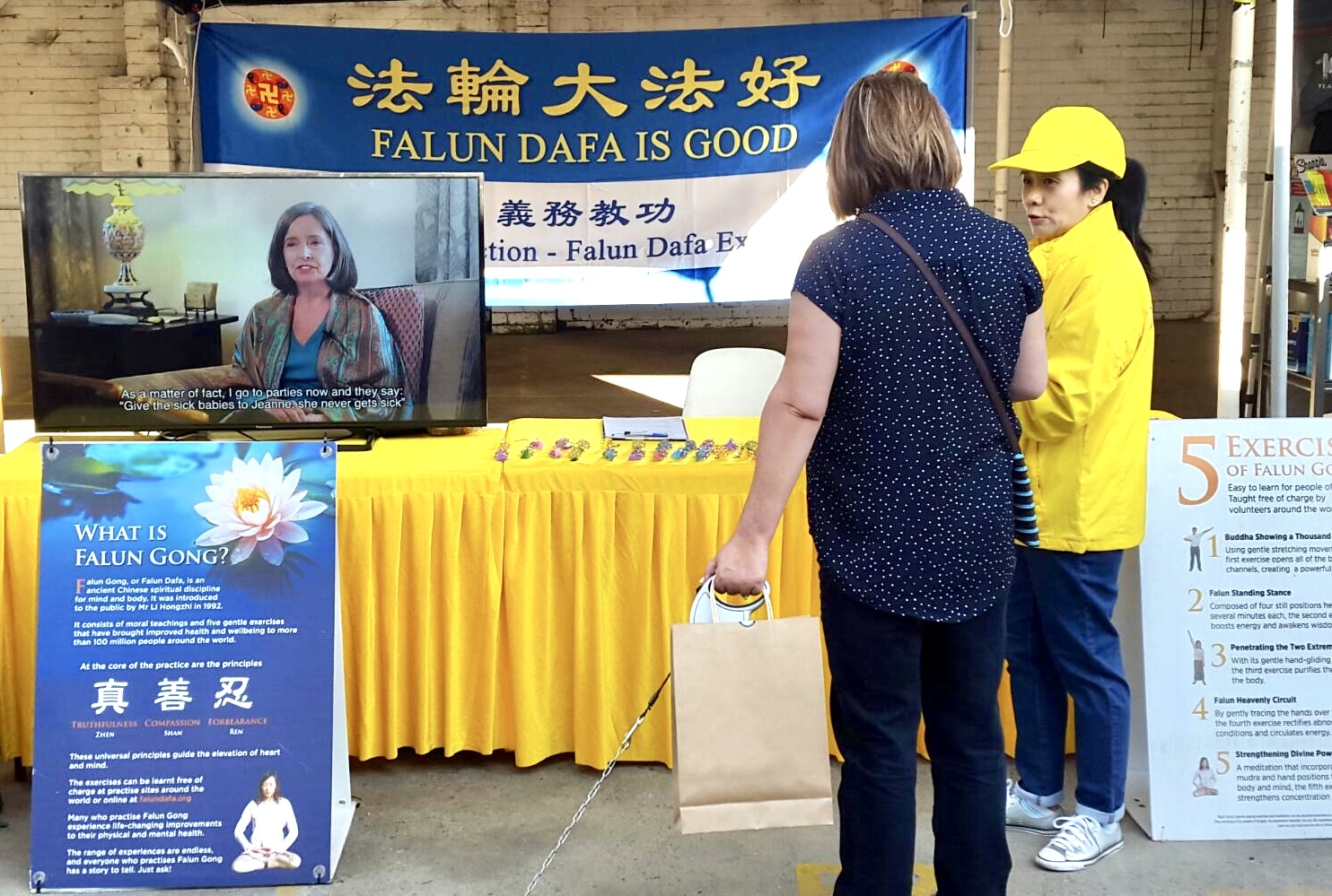 小生意业主华人宫先生在法轮功展位前流连忘返,他说他很想炼法轮功,但是目前工作很忙,心静不下来,他认为需要心无杂念,才能静心修炼、返本归真。