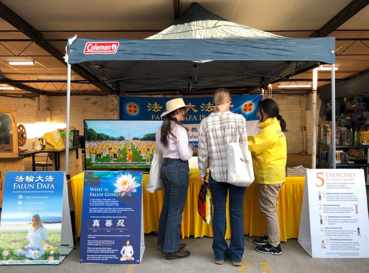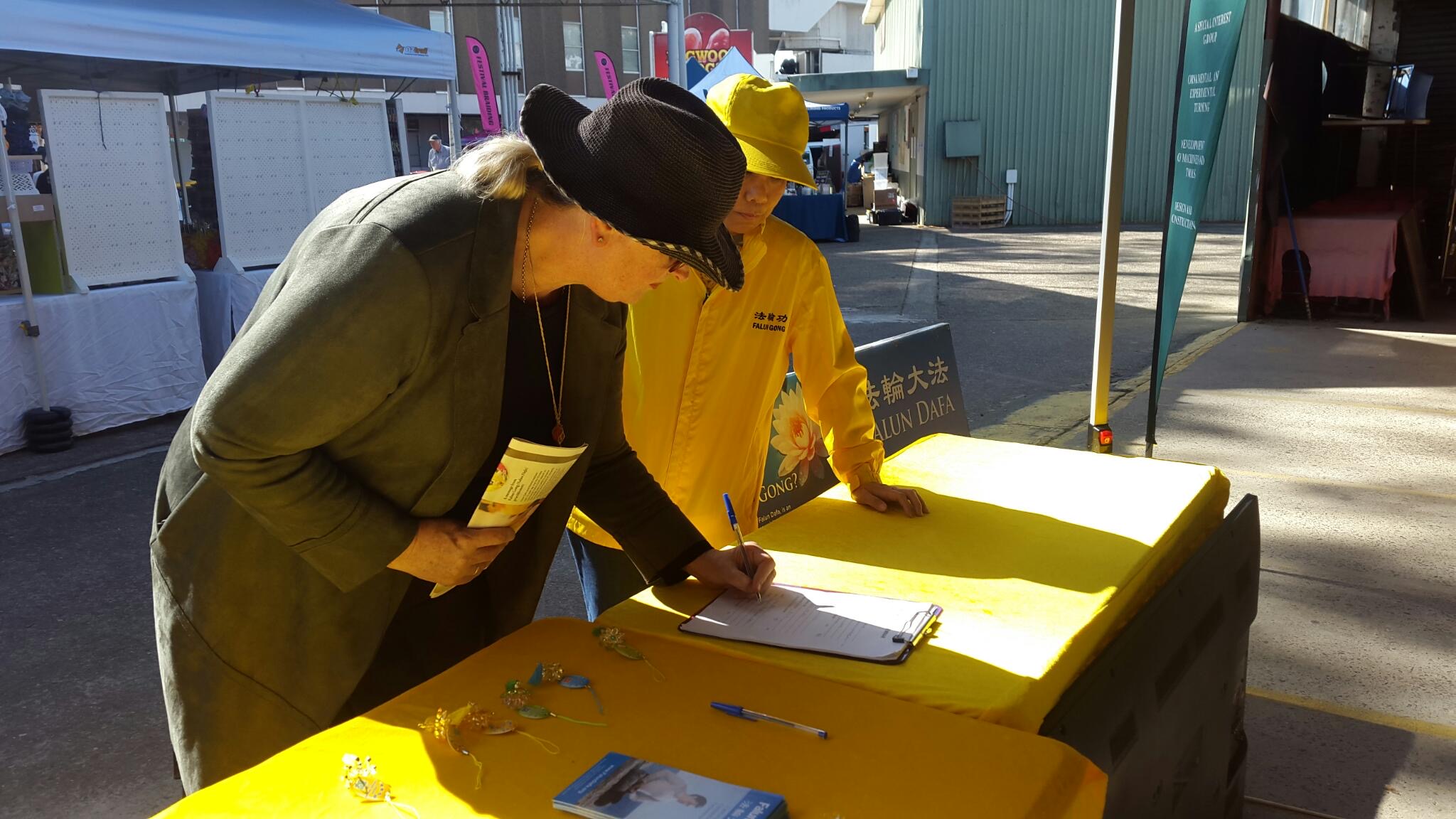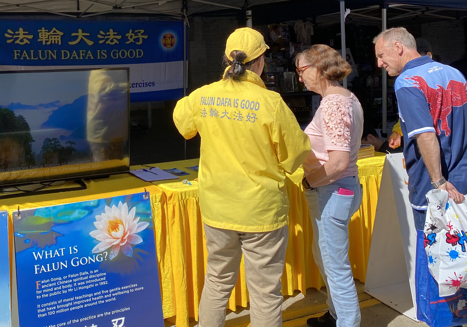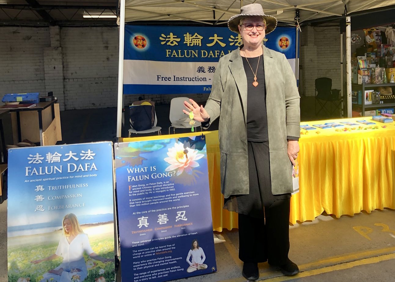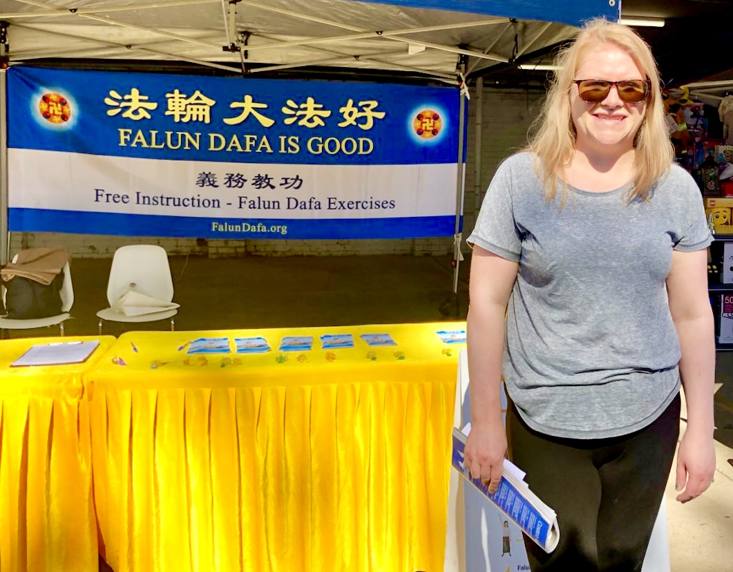 帕梅·米尔林(Pam Melling)走过法轮功演示功法的展位时,被祥和美好的能量场吸引,驻足了解法轮功。她说:“看到法轮功学员在演示功法,他们如此祥和、有活力,能感受到他们散发出一种非常祥和、纯真、美好的能量。”