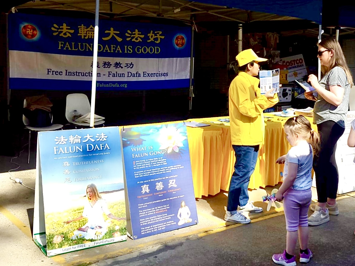 听闻法轮功学员介绍修炼法轮功详情,并得知法轮功学员将在周末在附近公园举办免费教功班时,她非常高兴,她说:“我正希望能找到一个在户外炼功、打坐的机会,今天看到你们在这展示祥和、放松的法轮功功法,我很高兴,我想参加。”