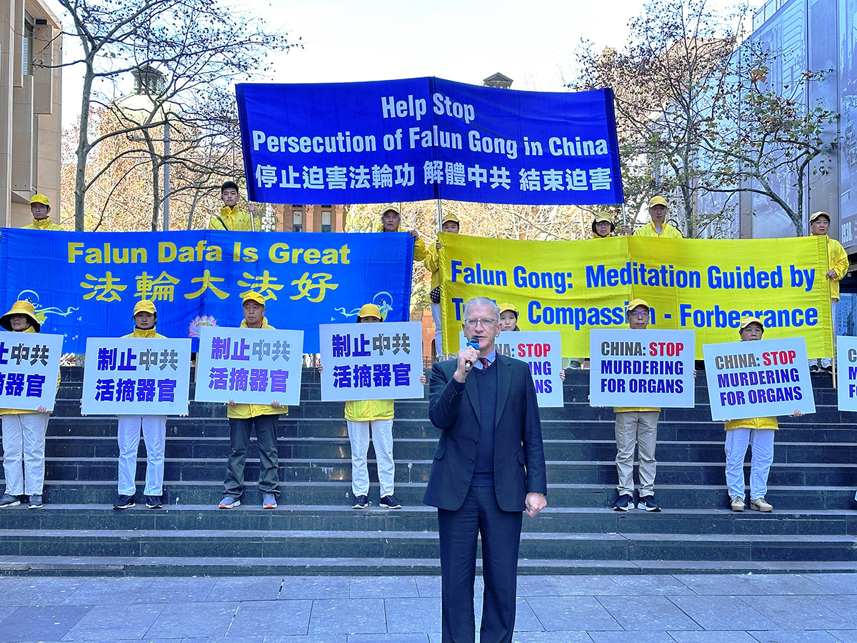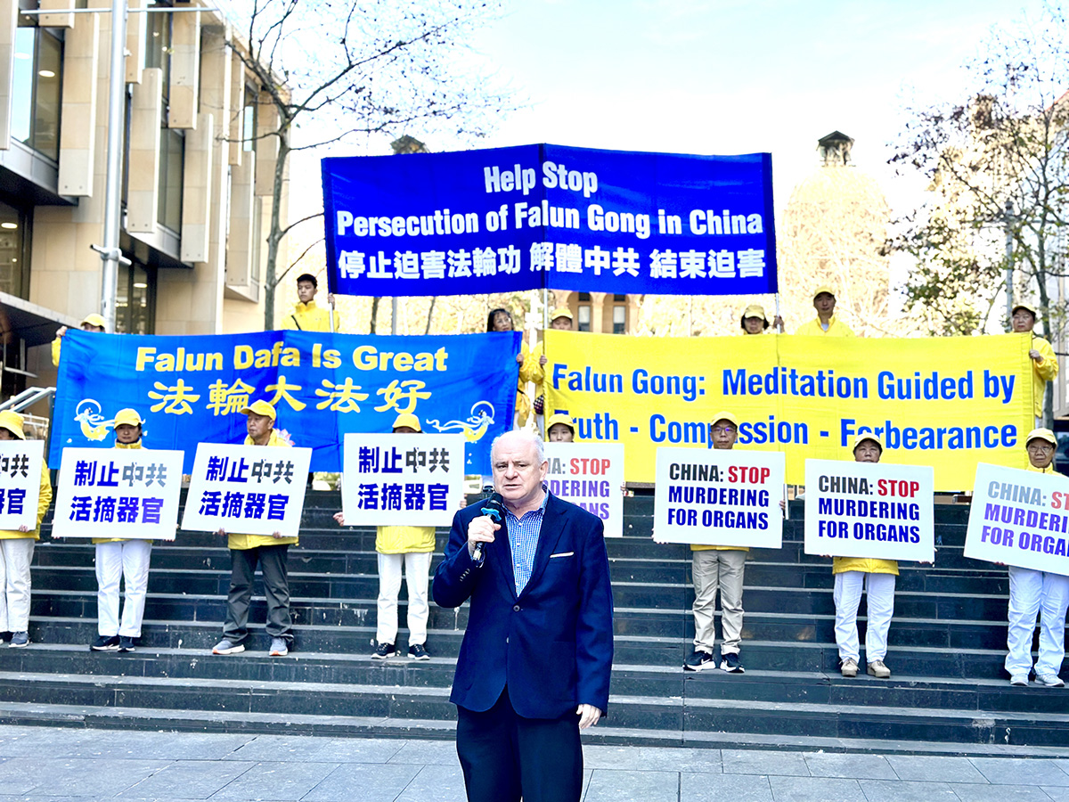 新南威尔州帕拉马塔市前市长威尔森(Andrew Wilson,former Lord Mayor of Parramatta City Council)在集会上谈到法轮功学员以和平的力量抵制中共的迫害。“这就是为什么我对我的法轮大法朋友如此尊敬”,他说。