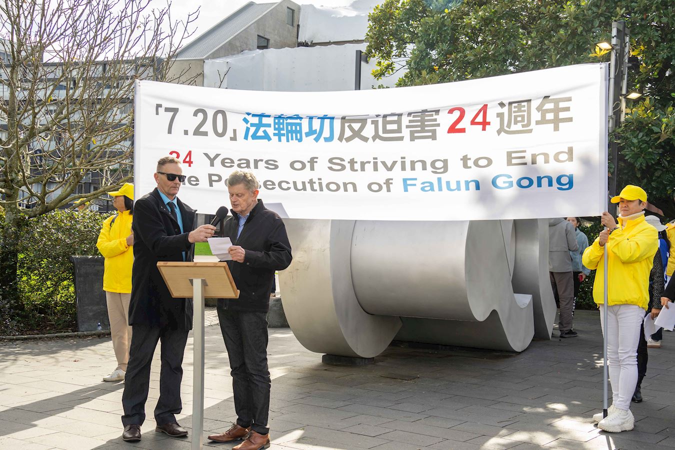 七月十五日,新西兰法轮功学员在奥克兰新市场(Newmarket)商业中心集会,主流社会各界人士到场演讲,他们敬佩法轮功二十四年来和平理性反迫害,给所有反暴政团体树立了榜样,同时希望人们积极主动地抵制中共对秉持真、善、忍信仰的法轮功学员的迫害。