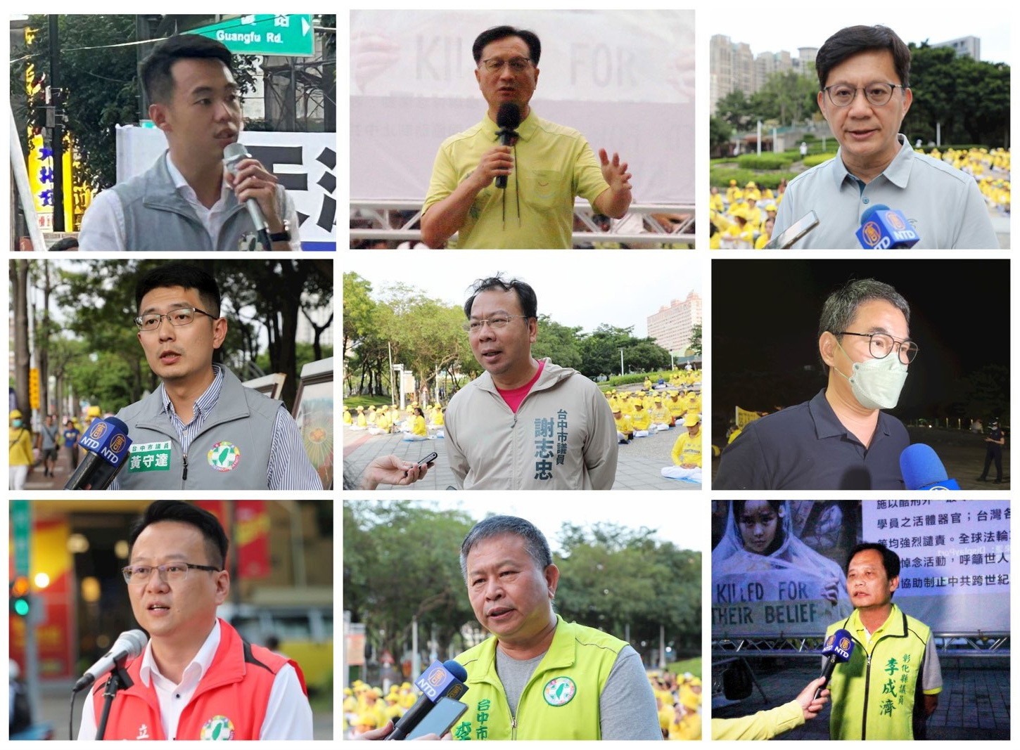 ![]() 图13:台湾中部地区与七月十五,十六日举办集会,台湾多位民意代表及政府官员到现场表达支持。从左到右为:彰化县议员杨子贤、彰化市长林世贤、台湾立委张廖万、台中市议员黄守达、台中市议员谢志忠 、台湾立委刘建国、台湾立委庄竞程、台中市议员李天生、彰化县议员李成济。 |