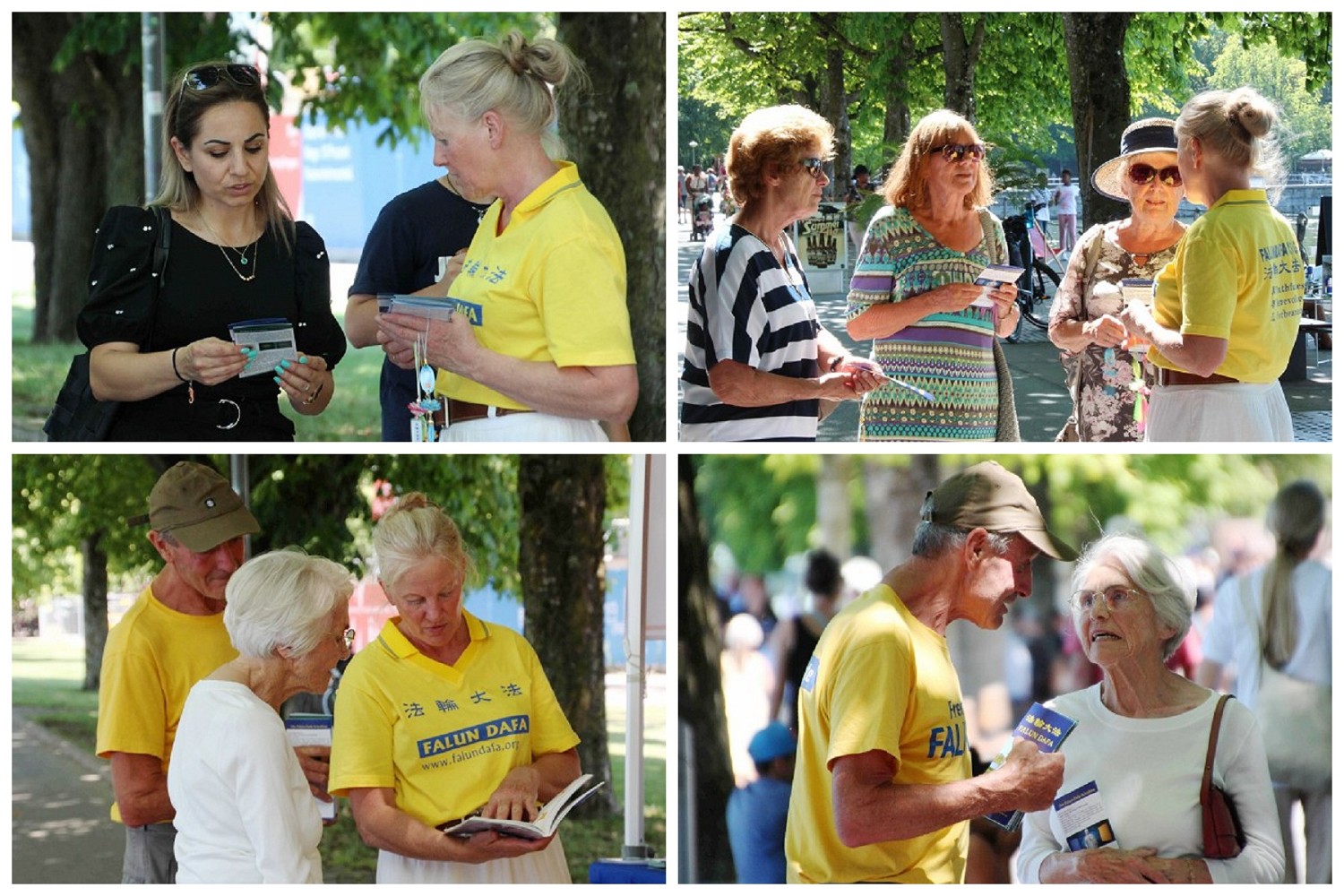 漫步在湖边时,已经退休的德语老师克里斯汀(Christine)接过了学员递来的真相资料,随后和学员交谈了很久,最后签名支持迫害。她认为中共迫害法轮功,甚至还活摘法轮功学员的器官:“这样的罪行应该被制止,这是谋杀,如此血腥,如禽兽一般,太不可理喻了,无法容忍,毫无人性。”