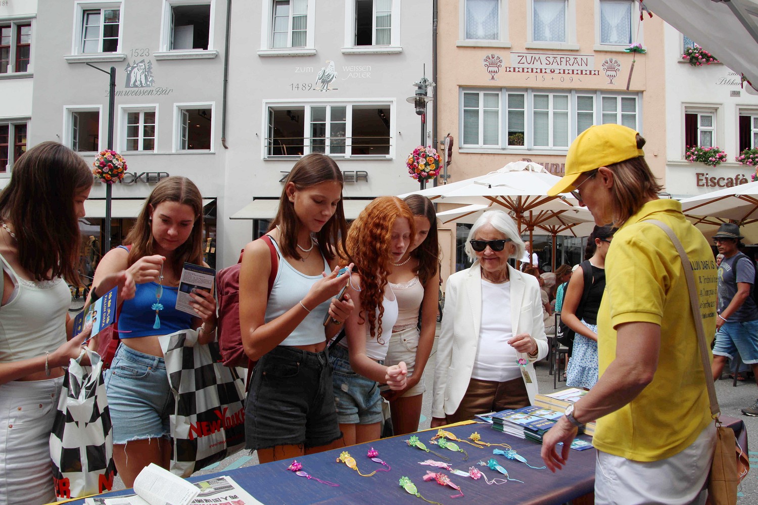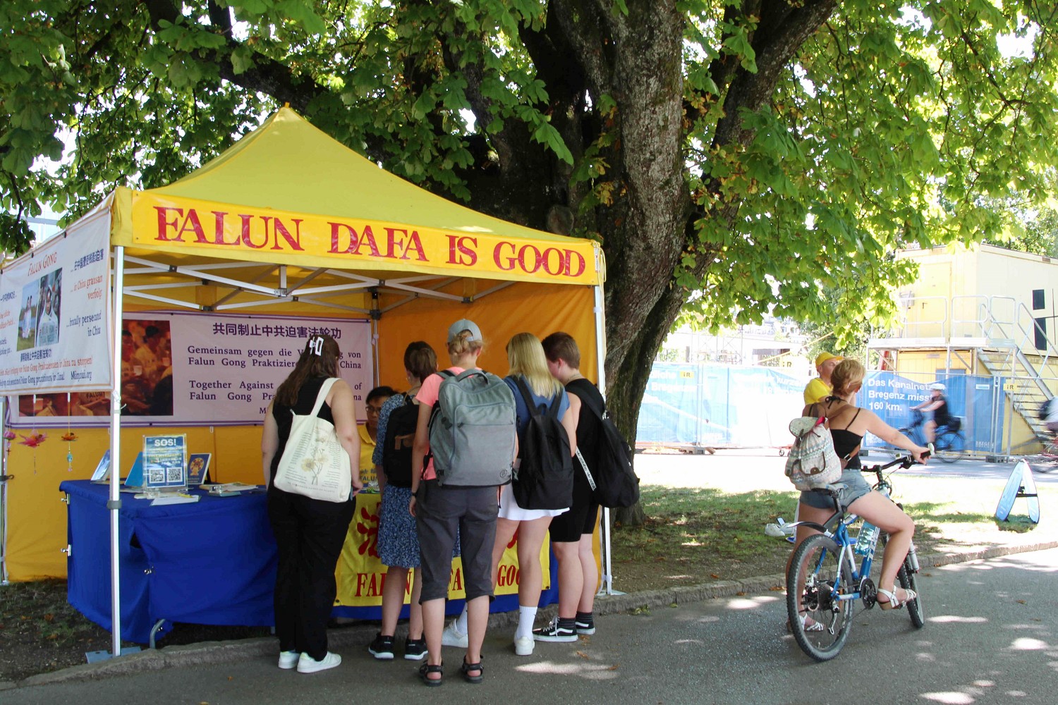 两周前,七月十五日,法轮功学员在布雷根兹的林荫道向民众介绍法轮功真相信息。劳拉是在那天的活动第一了解到法轮功学员遭到中共的血腥迫害,她当时就签了名支持法轮功学员反迫害。