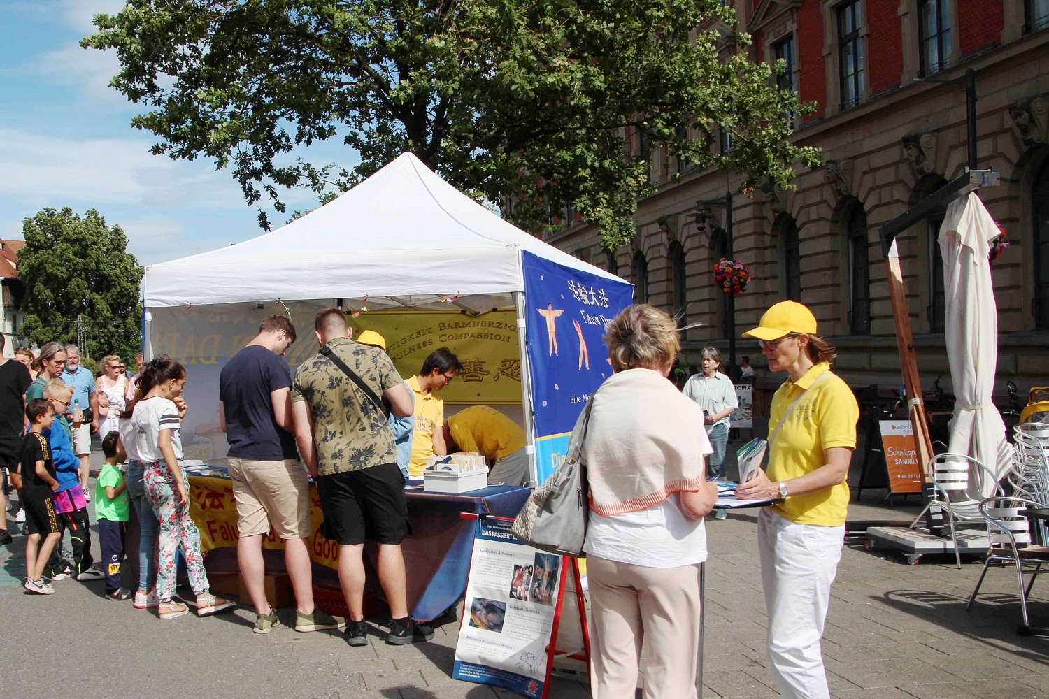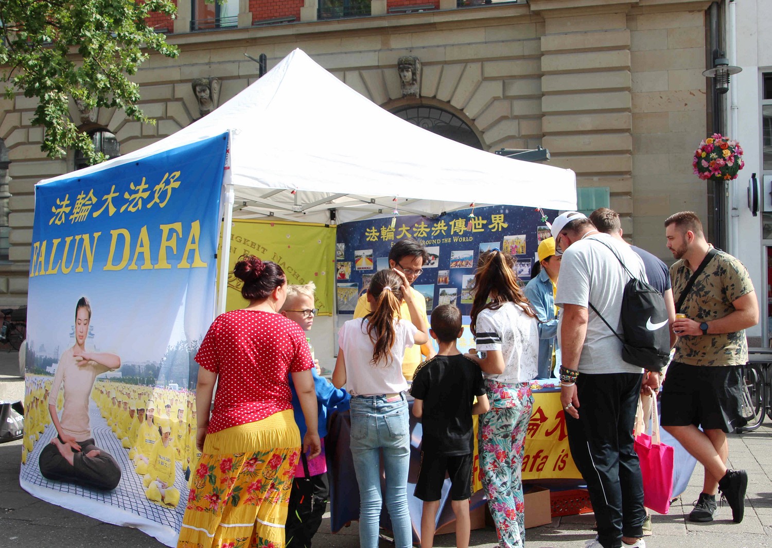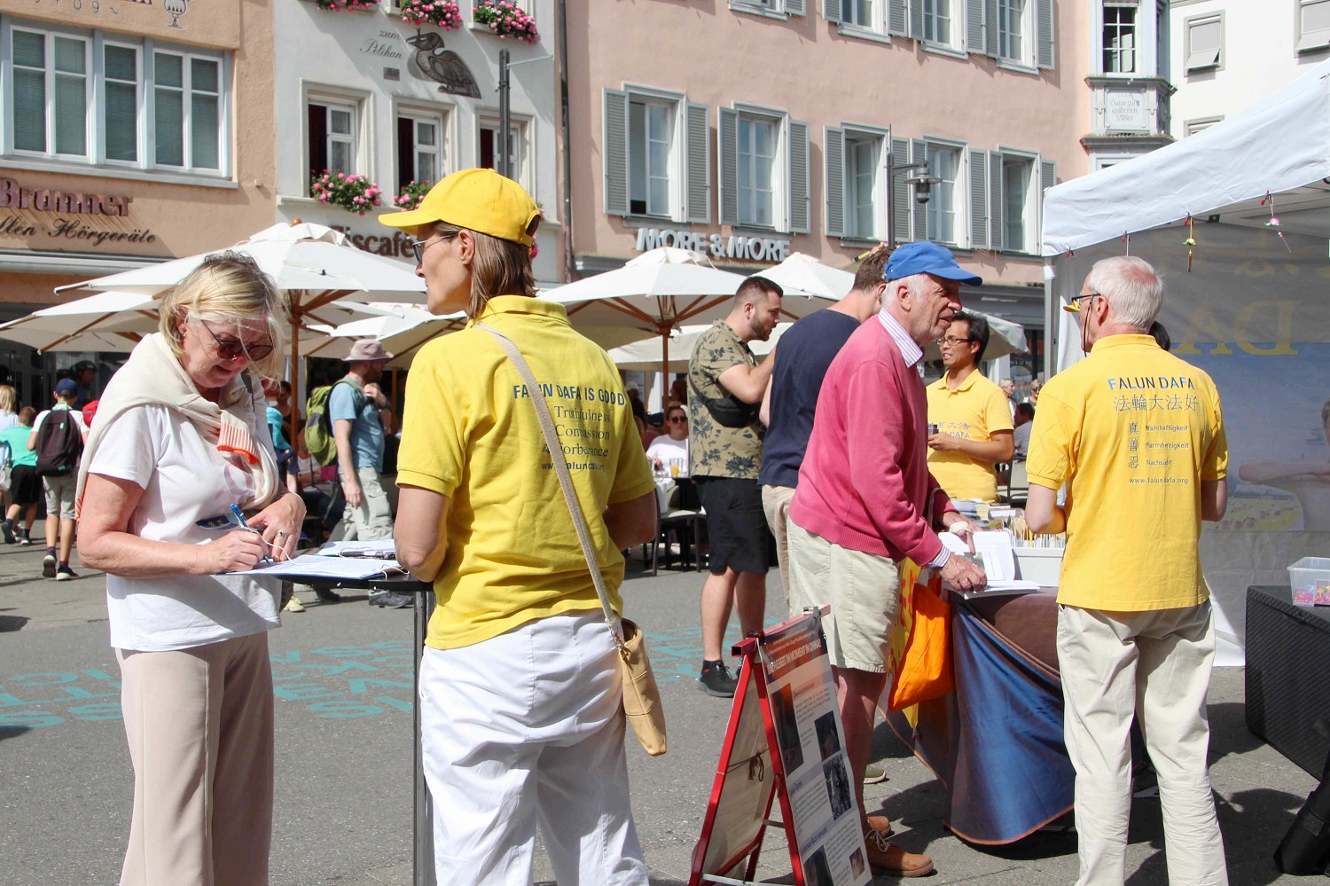 这一幕发生在二零二三年七月三十一日,博登湖西北岸的德国康斯坦茨(Konstanz)市中心的集市广场(Marktstaette)。当天法轮功学员来到这里向民众演示功法,发送真相资料,并征集签名,呼吁共同制止迫害。