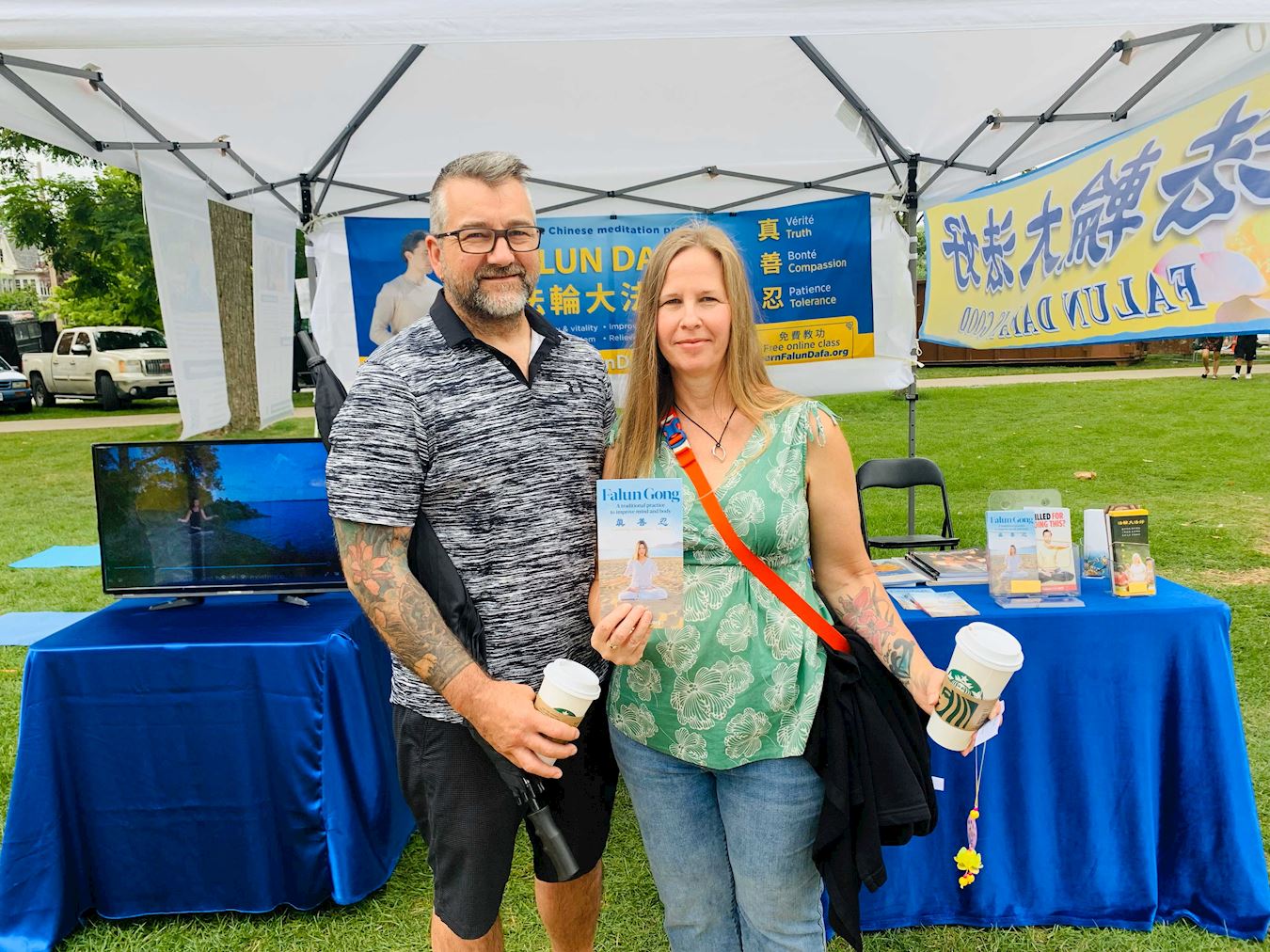 杰森(Jason)和太太是伦敦市的居民,看到学员们在展示功法,他们走近了展位,认真观看了介绍法轮大法的视频。