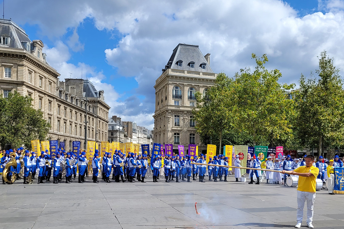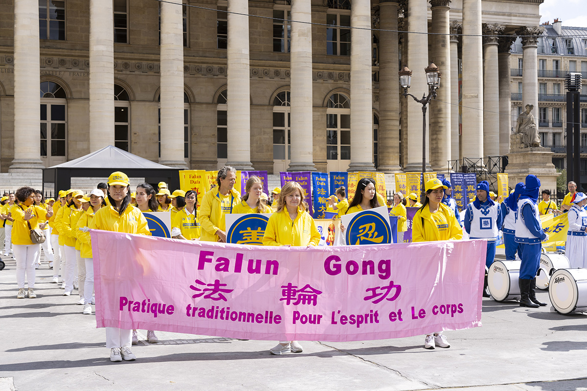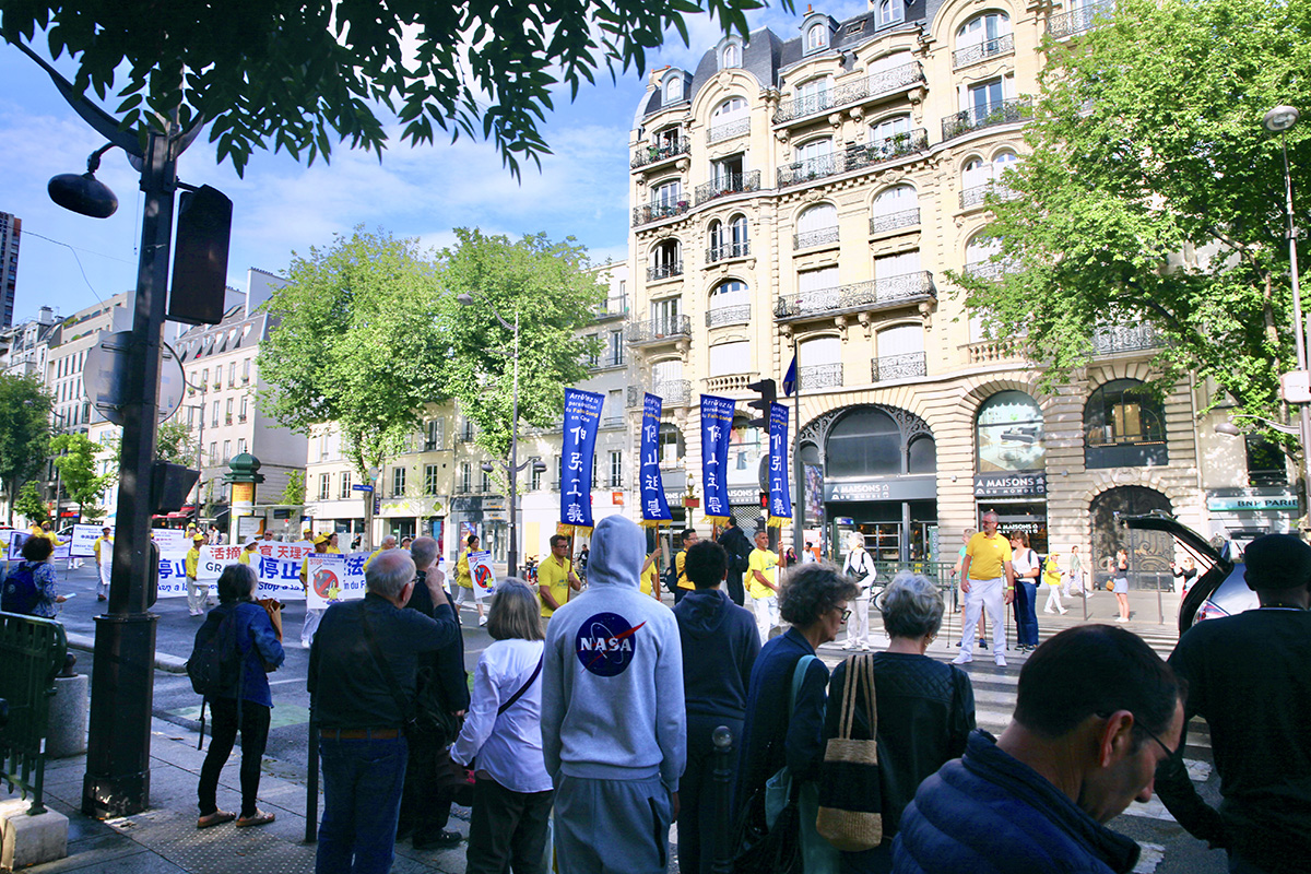 当天,一千四百多名来自欧洲各国的法轮功学员举办二场游行。第一场游行从共和国广场出发,途经圣殿街(rue du Temple)、塞巴斯托波尔林荫大道(boulevard de Sébastopol)、圣德尼林荫大道(boulevard Saint-Denis)、喜讯林荫大道(boulevard de Bonne Nouvelle)、普瓦索尼耶林荫大道(boulevard Poissonnière)等著名大道,最终抵达证券交易所。
