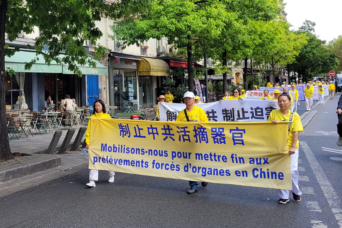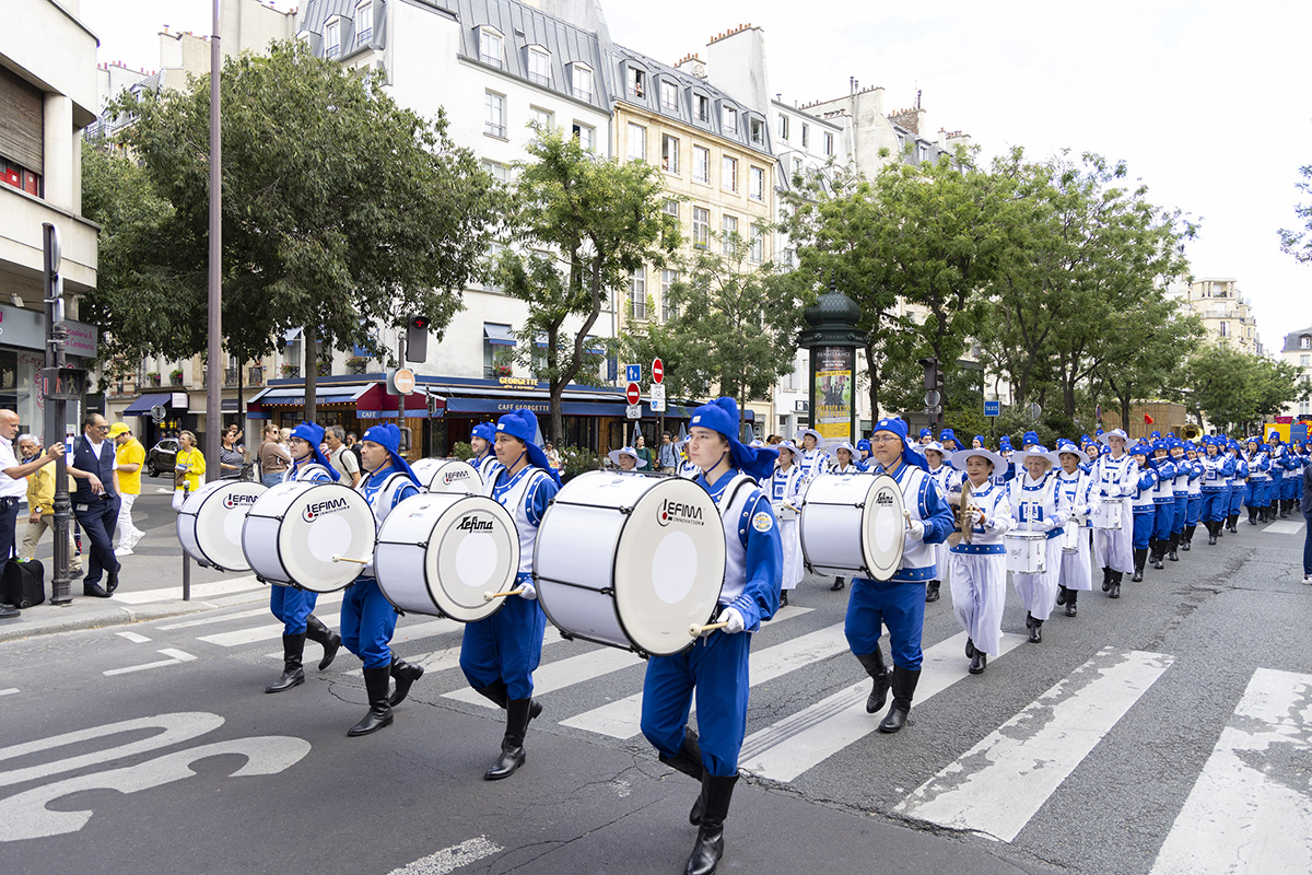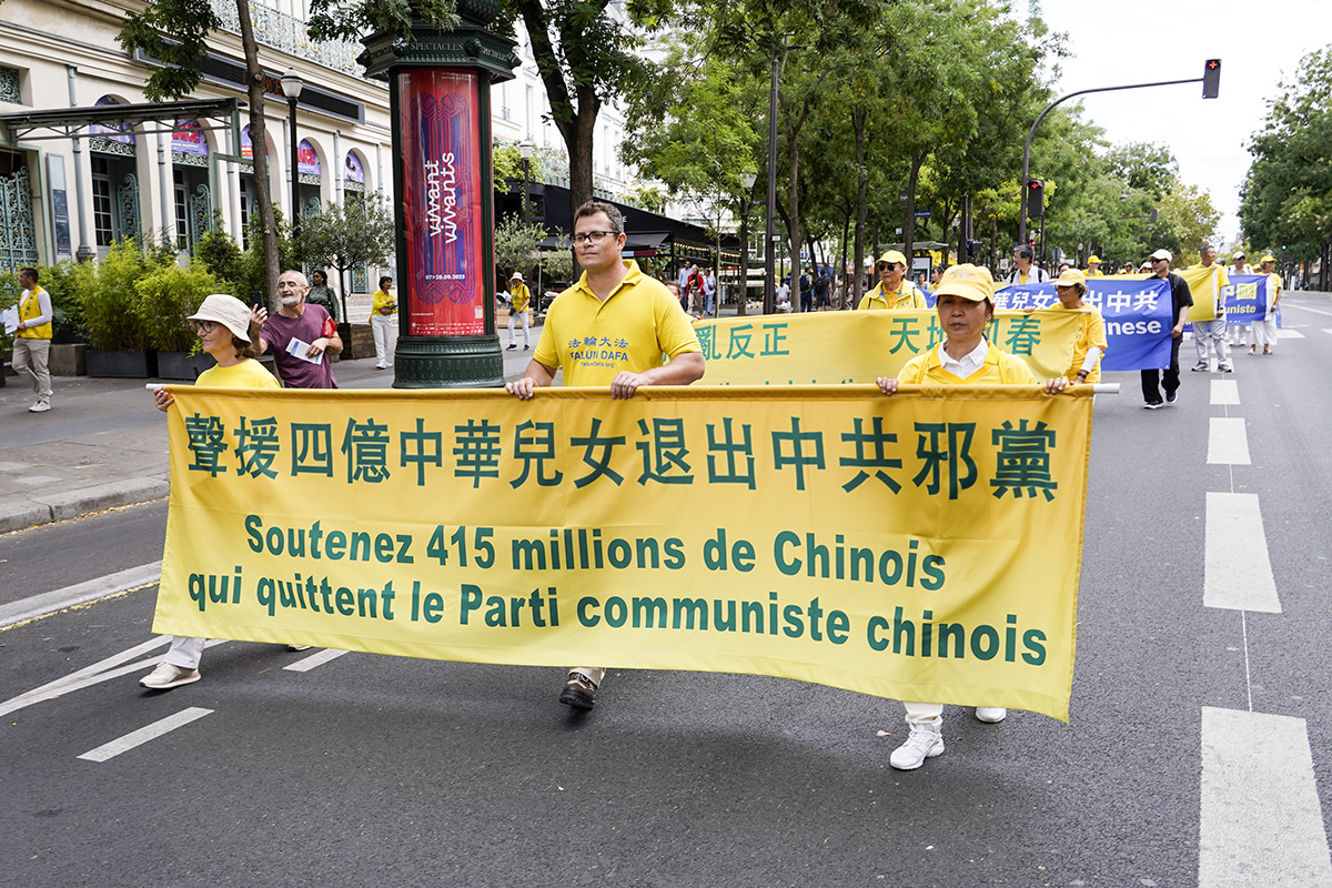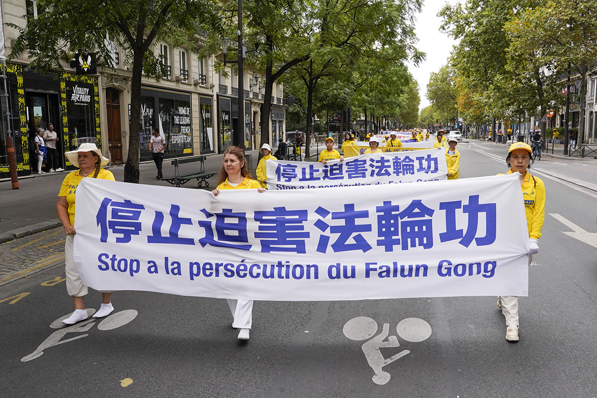 当天,一千四百多名来自欧洲各国的法轮功学员举办二场游行。第一场游行从共和国广场出发,途经圣殿街(rue du Temple)、塞巴斯托波尔林荫大道(boulevard de Sébastopol)、圣德尼林荫大道(boulevard Saint-Denis)、喜讯林荫大道(boulevard de Bonne Nouvelle)、普瓦索尼耶林荫大道(boulevard Poissonnière)等著名大道,最终抵达证券交易所。