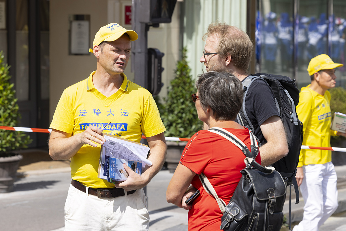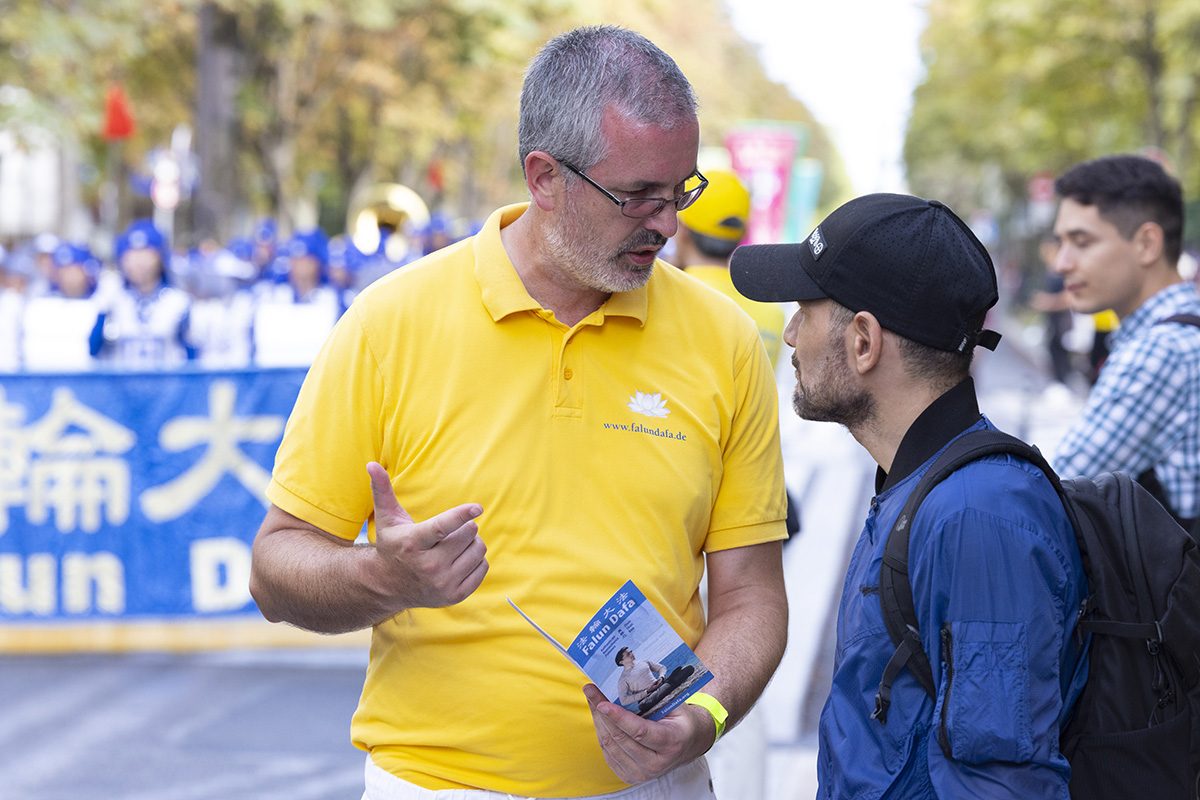 这不是他第一次看到法轮功学员的活动,在伦敦唐人街他也看到过很多法轮功学员在街上分发传单。