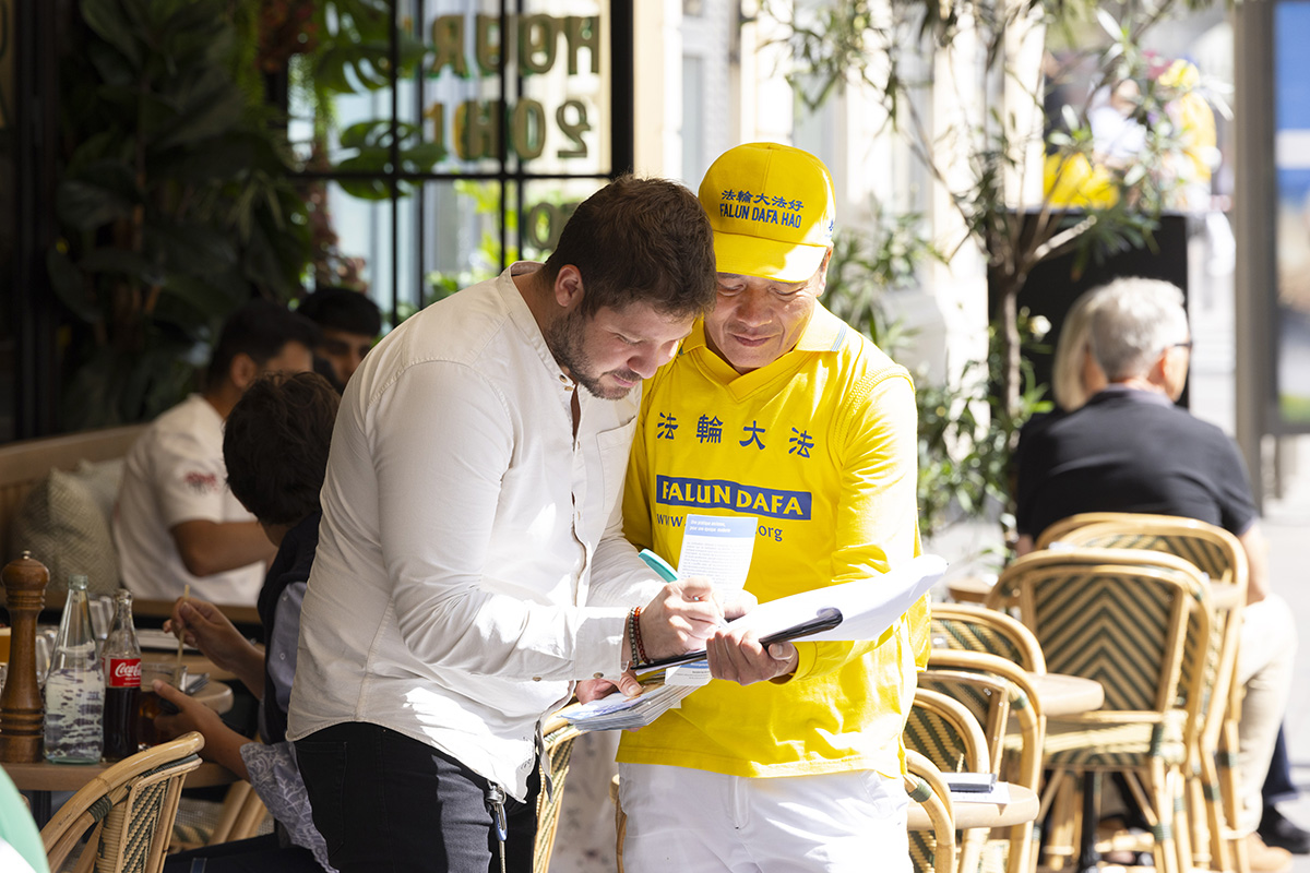 保安赛贝尔先生(Salhi Saber)签名支持法轮功学员发迫害。他表示,这是第一次看到法轮功的游行,认为游行“很和平”,并说他知道中共杀无辜者,他认为“在法国举行这种反迫害活动,是件非常好的事”,因为能“让大家了解中国(中共)发生了什么事情”。