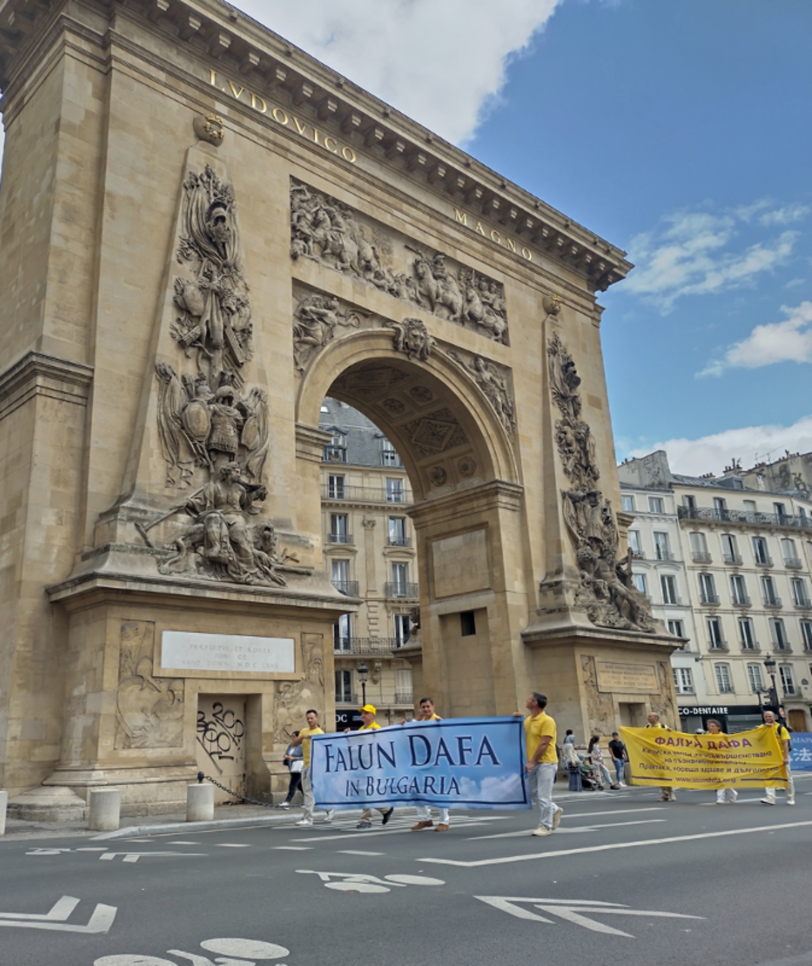 八月二十六日,保加利亚各地的学员前往法国巴黎,与一千四百多名欧洲学员们一同参加法会之前举办的集会游行活动,向人们传播法轮功的美好。
