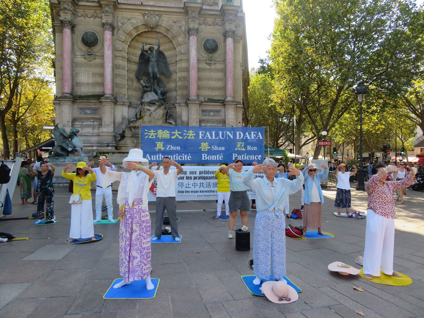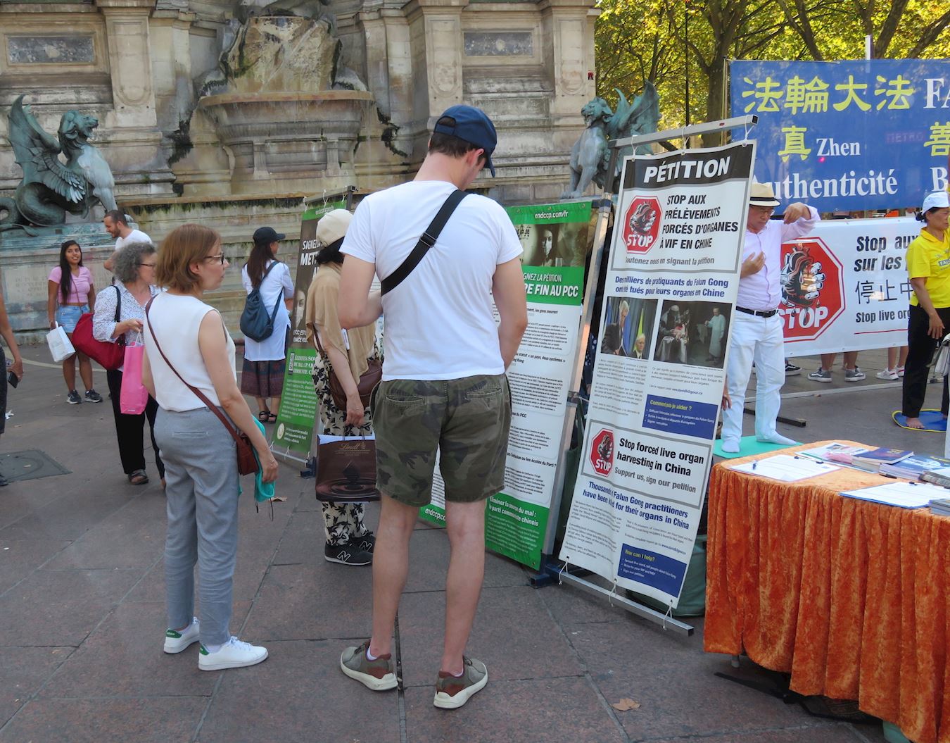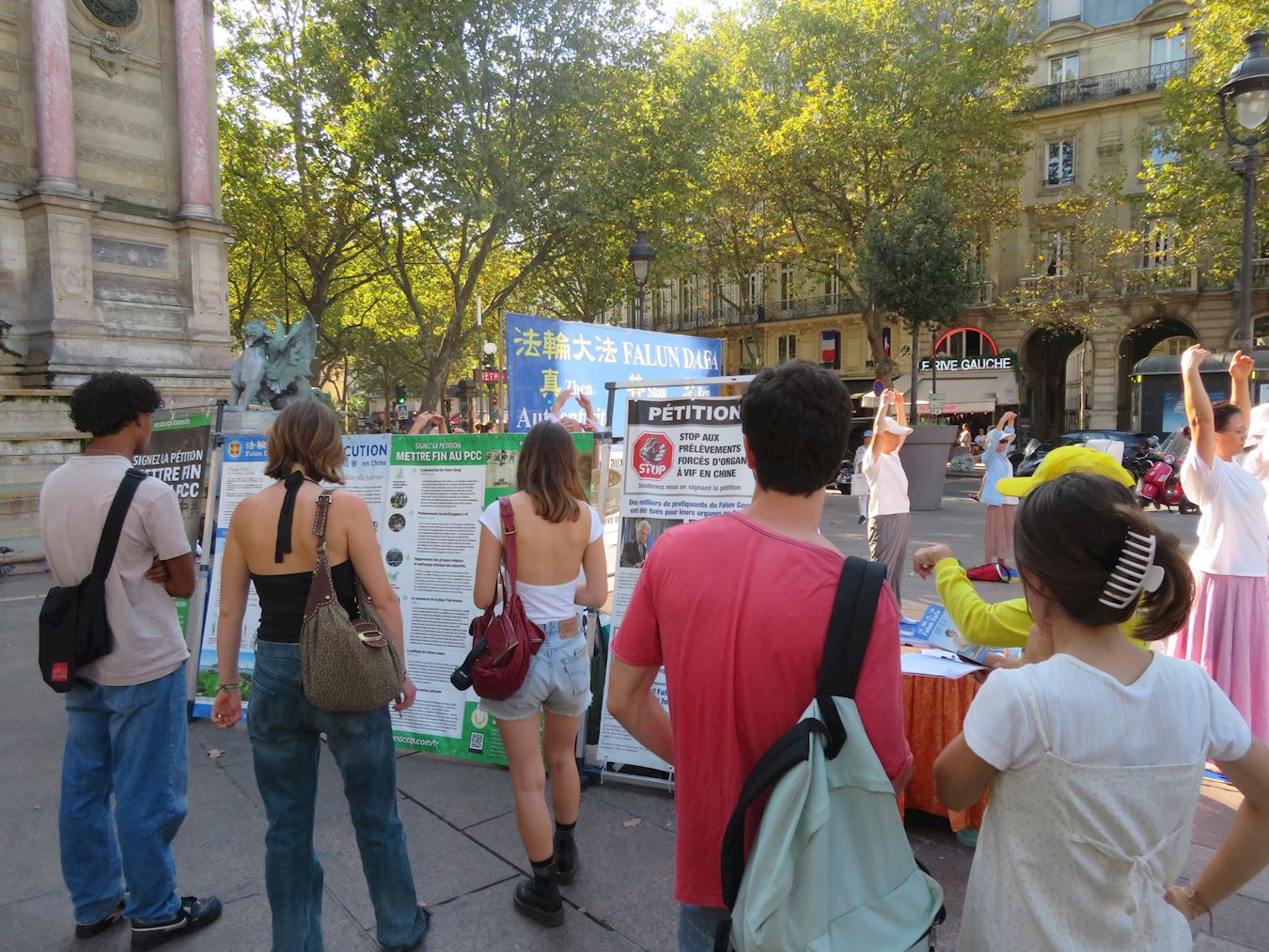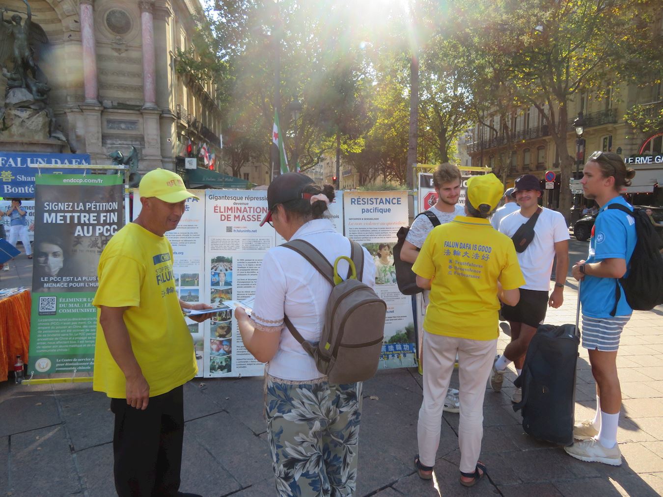 这一天,圣米歇尔广场来往行人很多。不少人匆忙中接过了法轮功学员递上的传单,很多人都驻足观看,他们被法轮功功法所吸引,想了解更多如何修炼的信息。当人们知道法轮功学员在中国大陆被中共迫害,甚至被强摘器官时,纷纷在反迫害请愿书上签字,支持法轮功学员的行动,呼吁制止中共迫害。