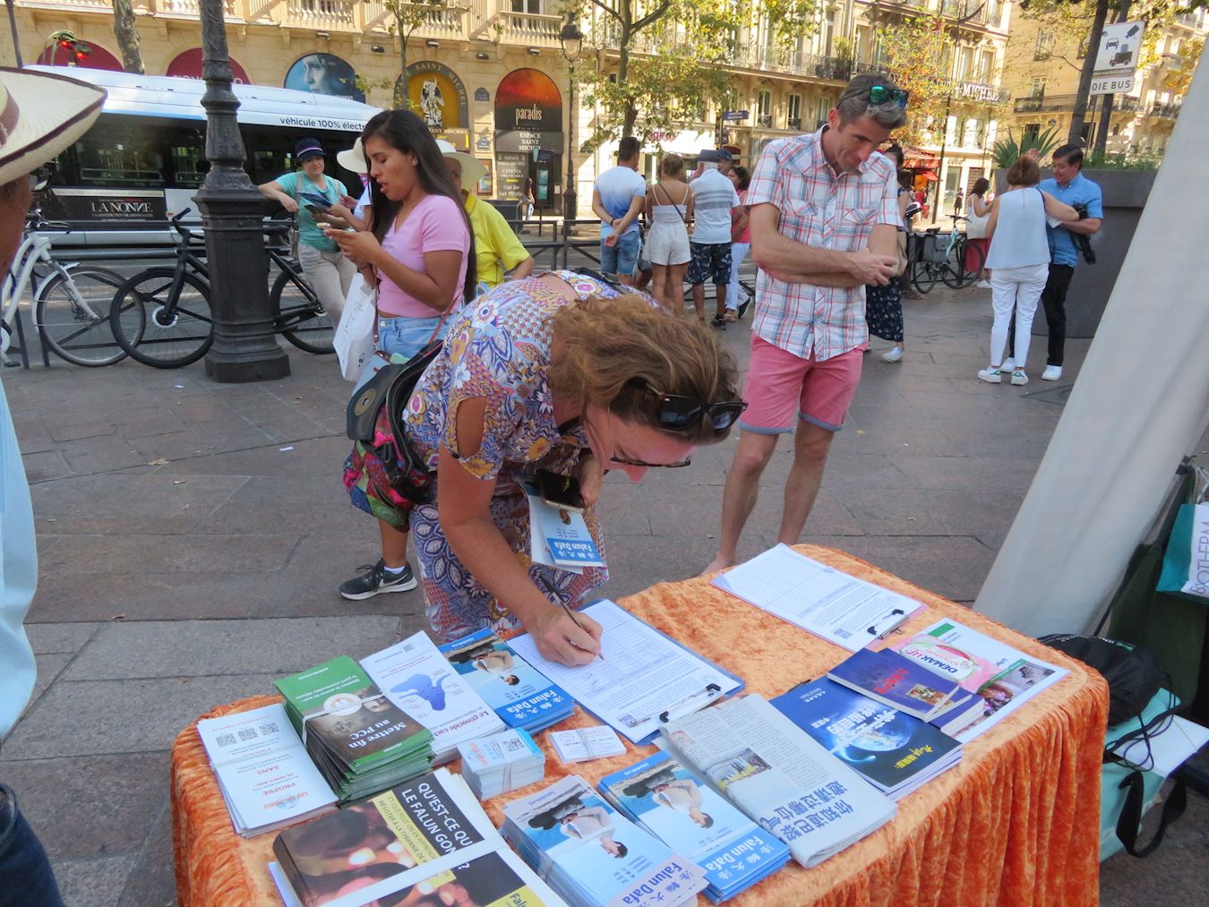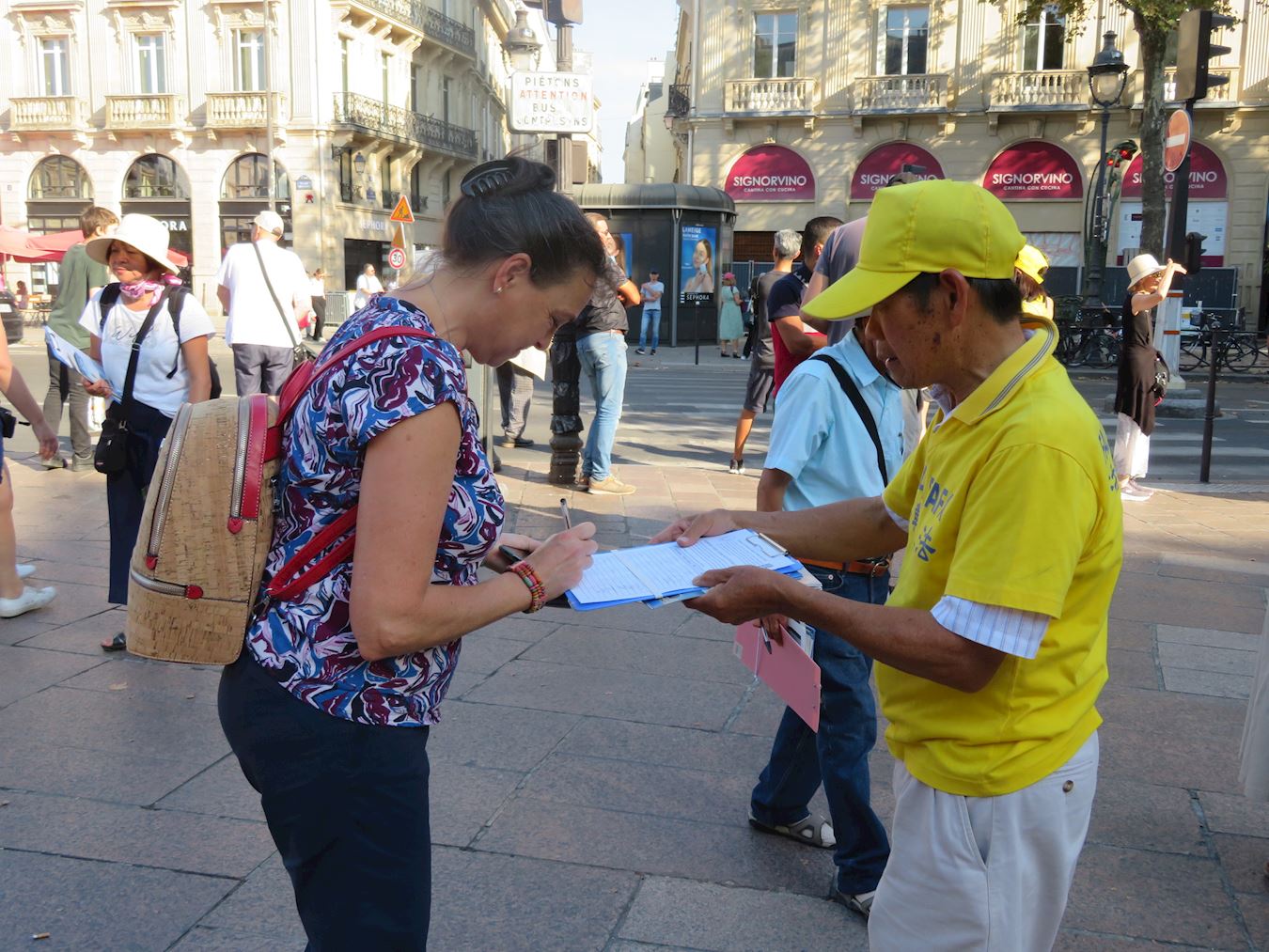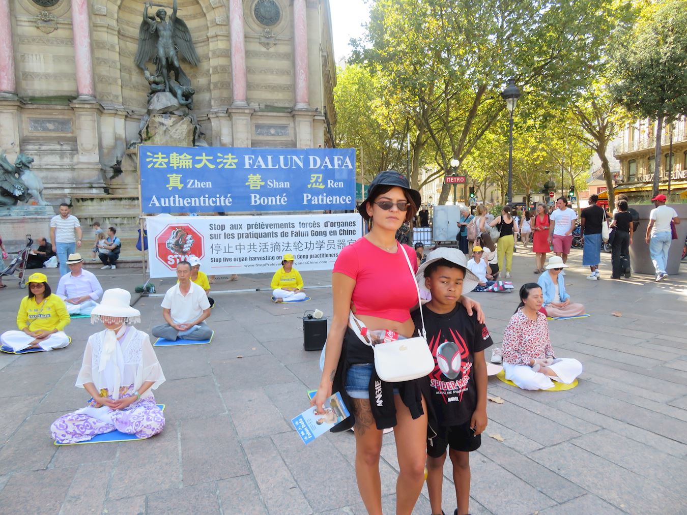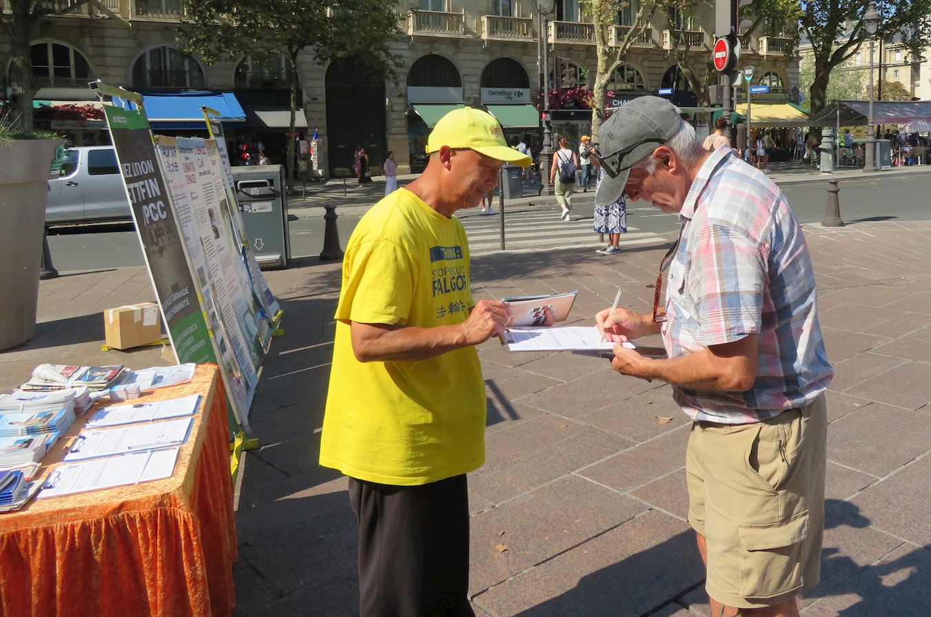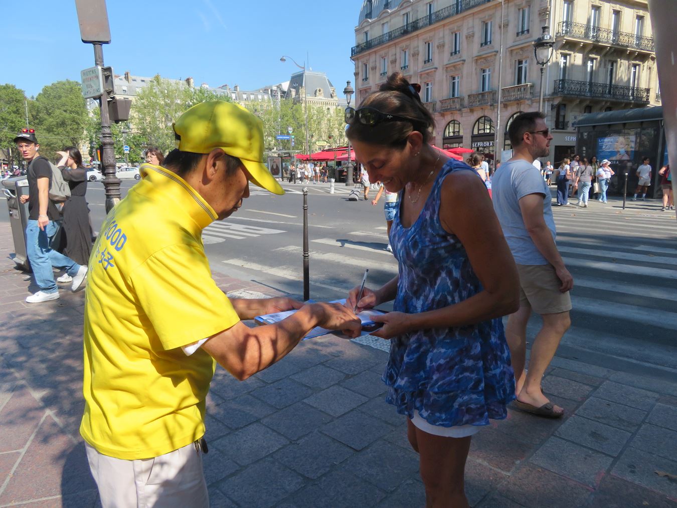这一天,圣米歇尔广场来往行人很多。不少人匆忙中接过了法轮功学员递上的传单,很多人都驻足观看,他们被法轮功功法所吸引,想了解更多如何修炼的信息。当人们知道法轮功学员在中国大陆被中共迫害,甚至被强摘器官时,纷纷在反迫害请愿书上签字,支持法轮功学员的行动,呼吁制止中共迫害。