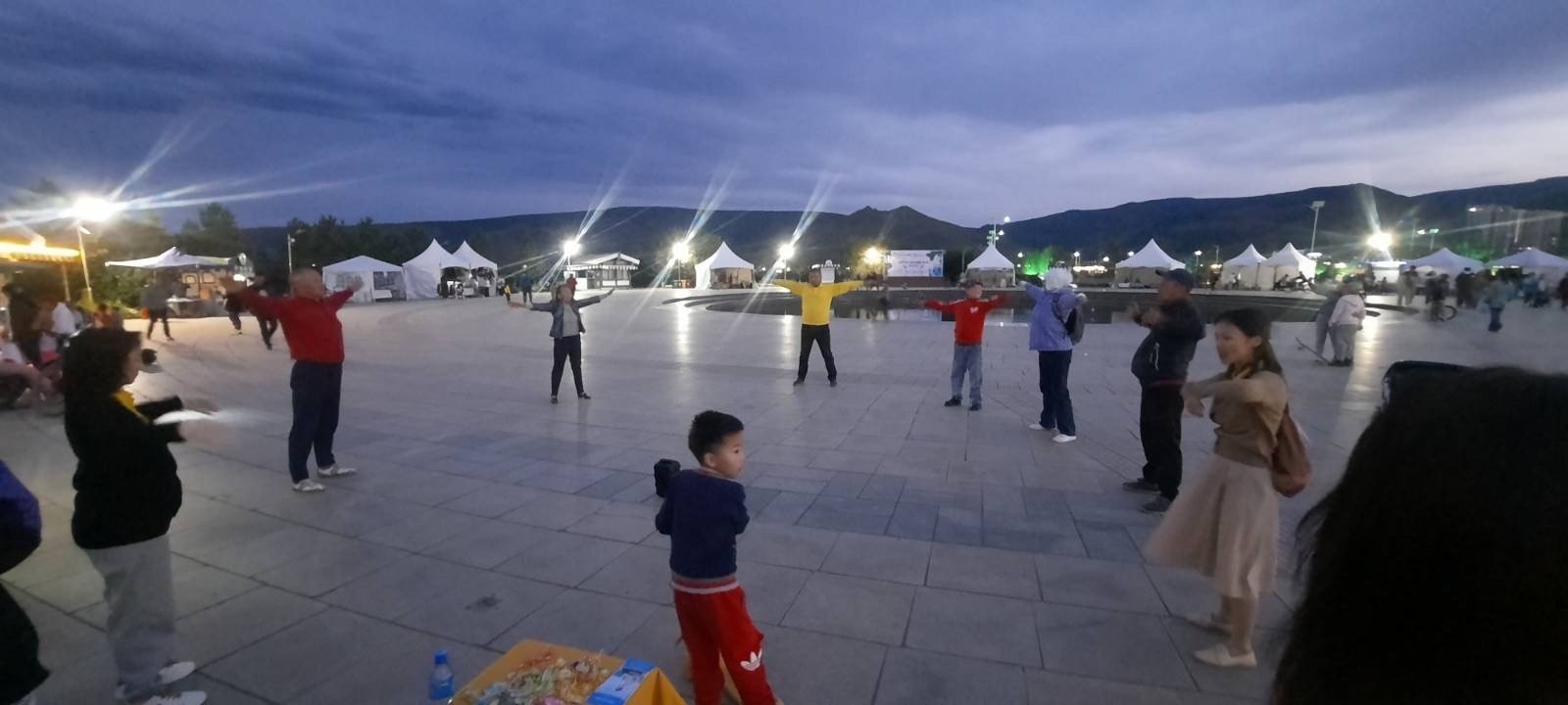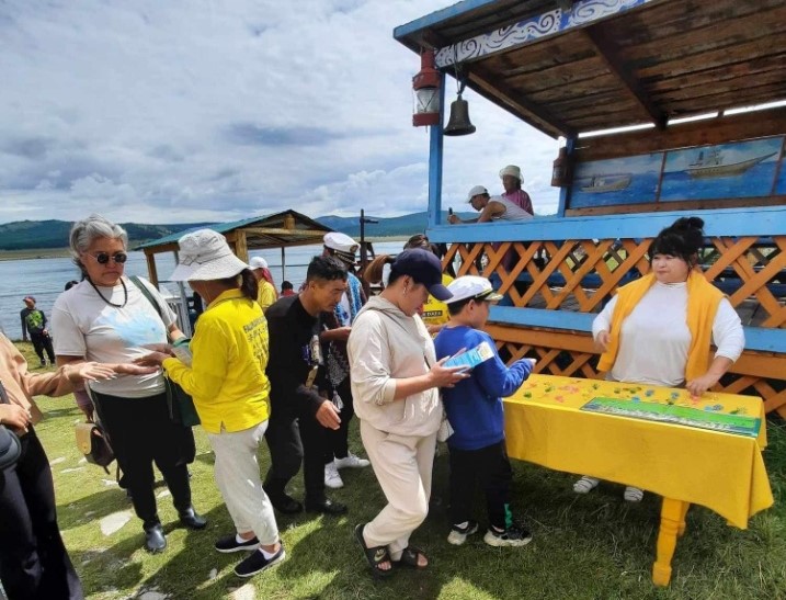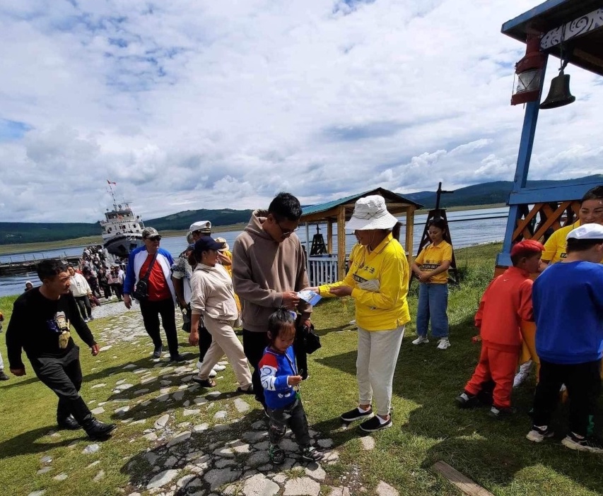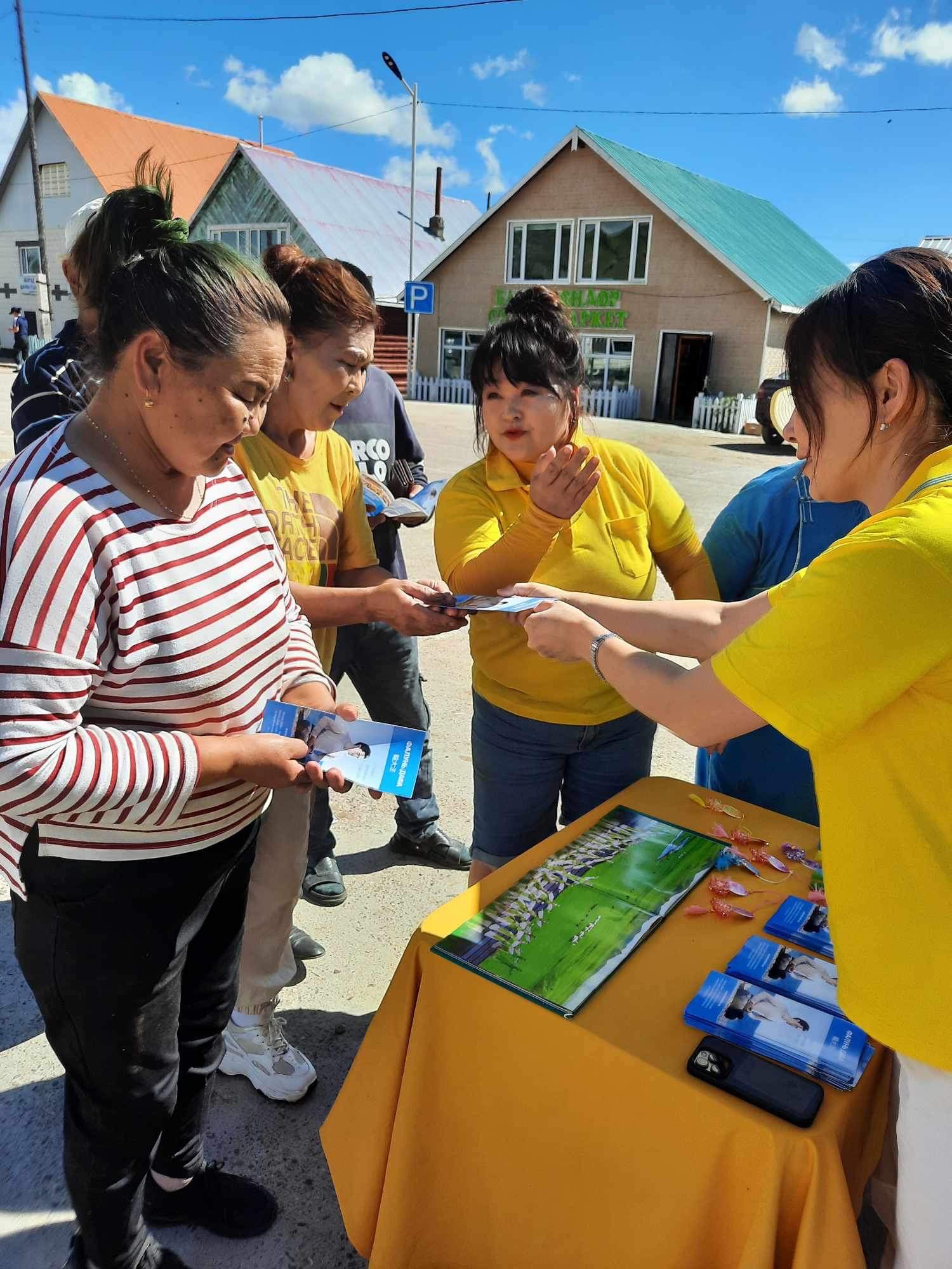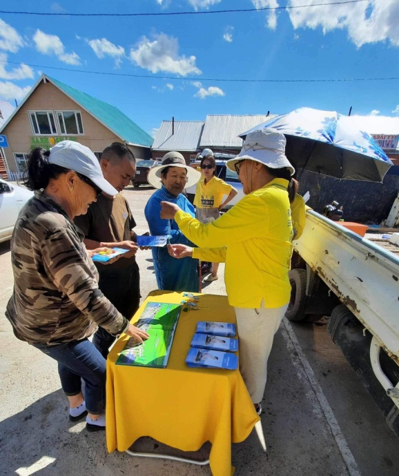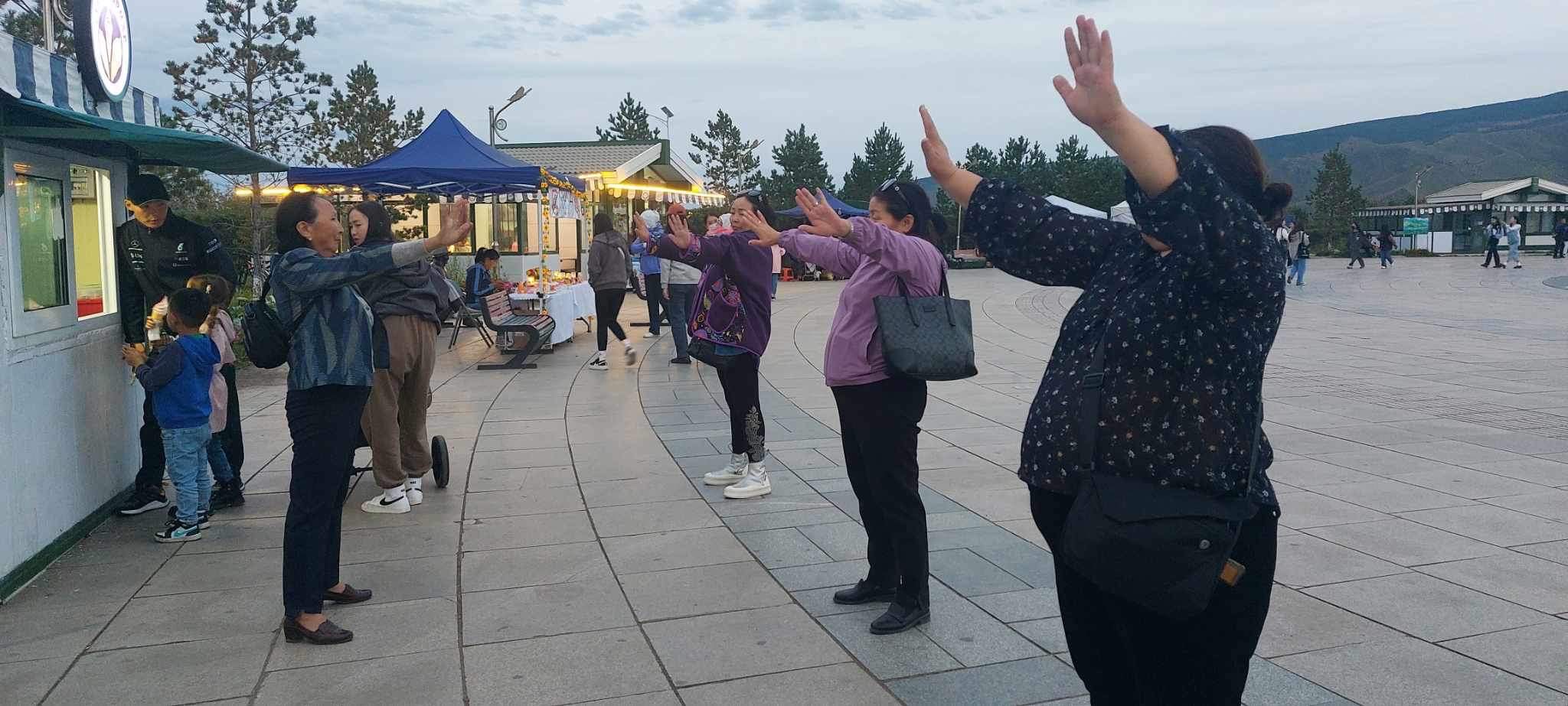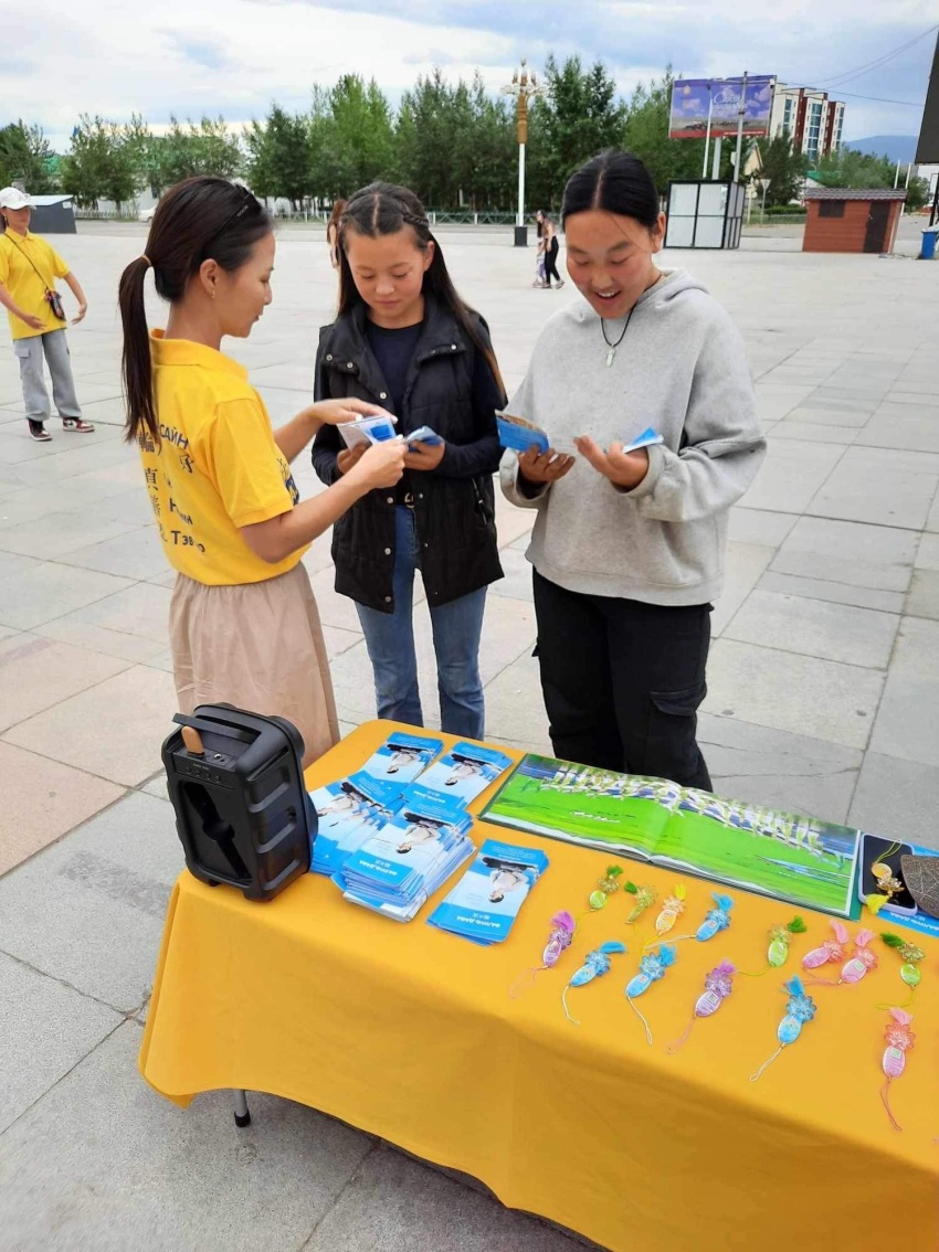 民众对大法表现出了浓厚的兴趣,孩子们看到精美的小莲花,喜笑颜开。大人们则咨询如何学功,并现场向学员学习五套功法,直到傍晚天黑了,还有人不愿离去,和学员交谈了解更多的信息。