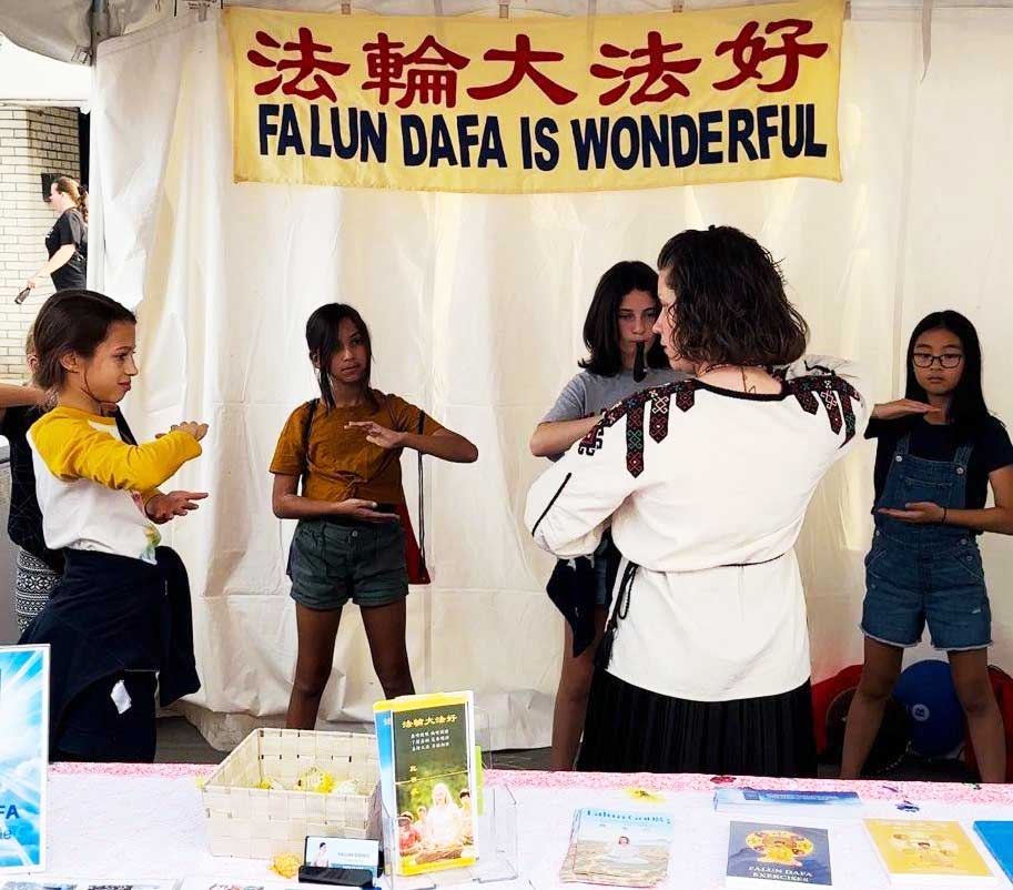 这次,当她再路过展位的时候,看到学员正在教谢尔文炼功,菲尔斯也想要一起学。她说,“我一直都认为打坐很难。因为我想要静下来,可是脑子却总容易想着一些事情。所以,我想和你们一起炼功,帮助我专注、放松。”于是,她跟着学员学习了动功和静功的功法。