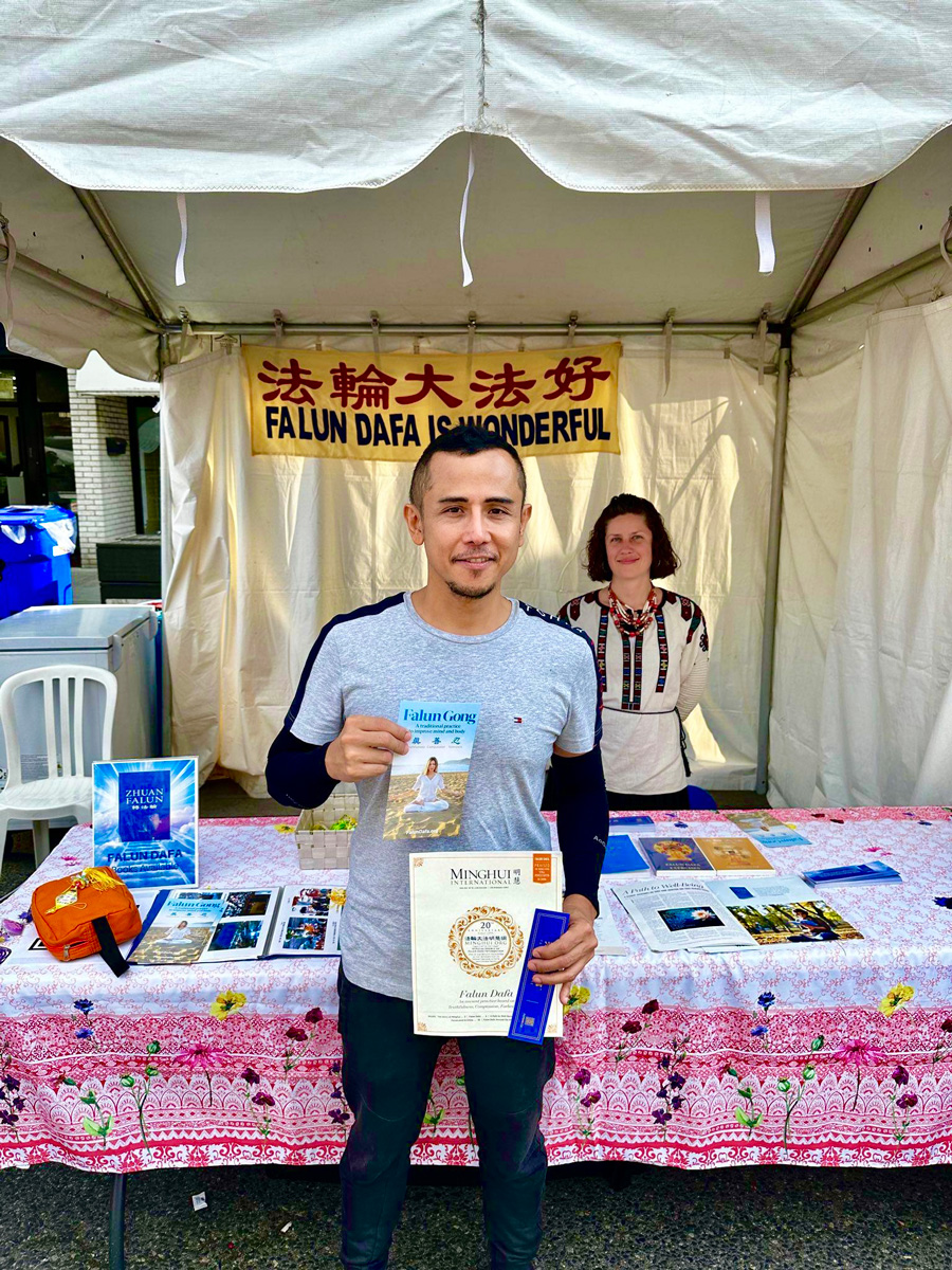 阿尔瓦罗(Alvaro)在市中心见到过法轮功学员发传单、讲真相。他来到展位前,听了对大法的详细介绍后,对学员说想要学功。