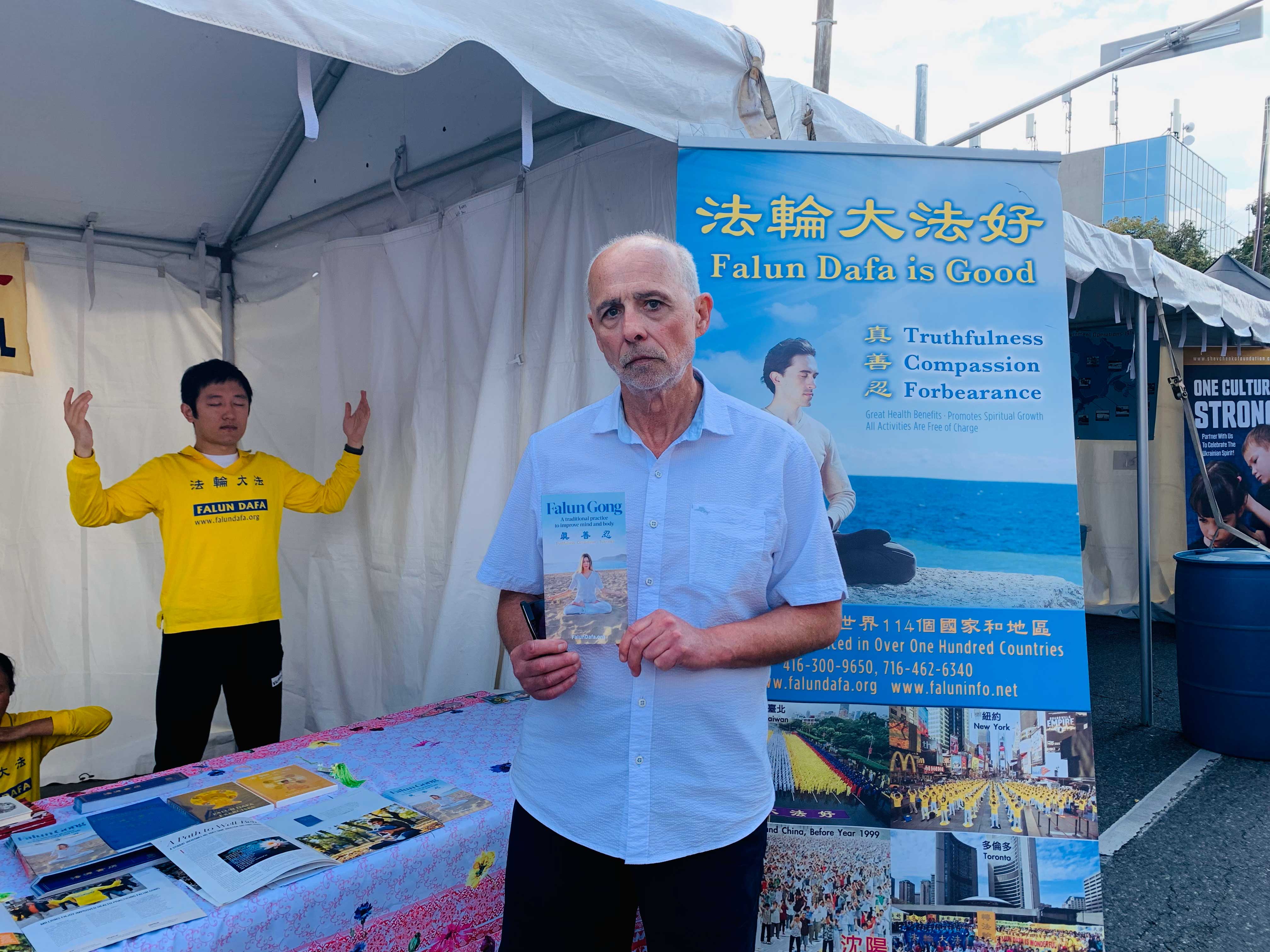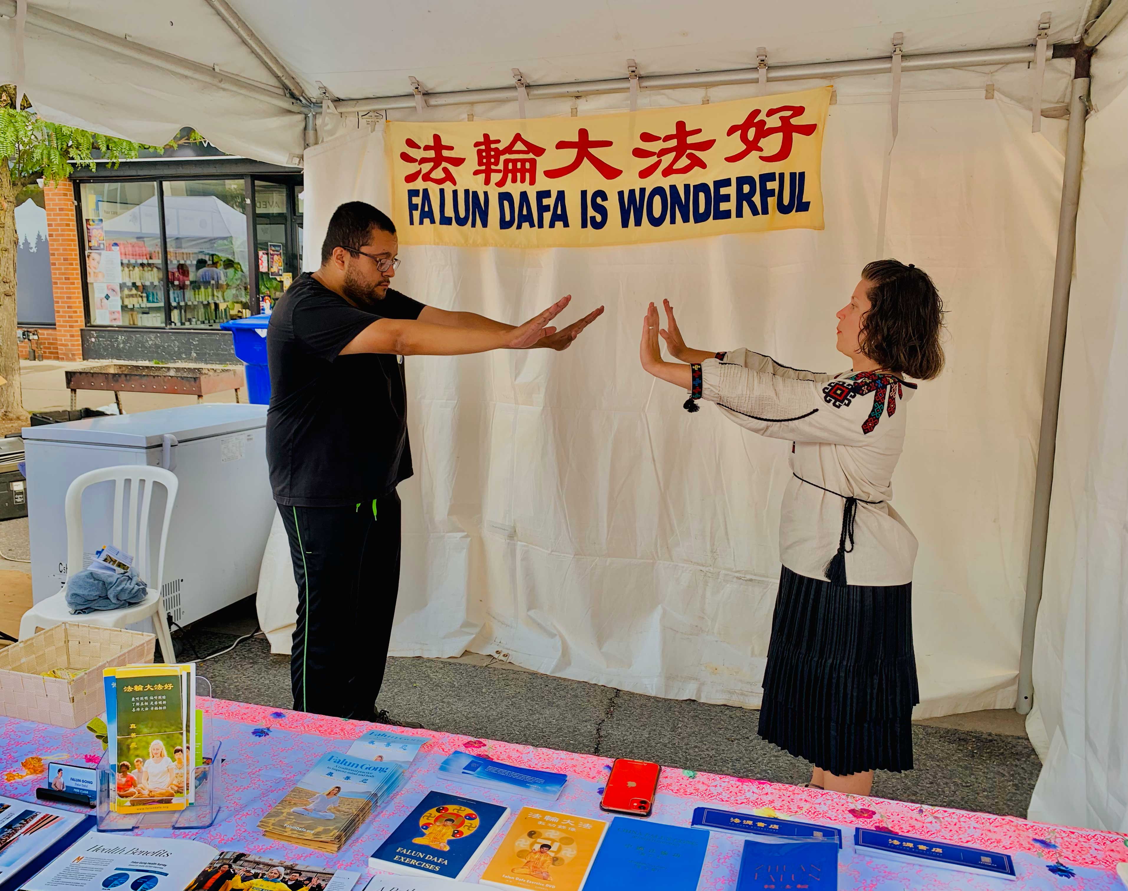 谢尔文(Sherwin)路过法轮大法展位时,听到了炼功的音乐。他顺着声音走了过来,要学员教他炼功。接着,他学炼了一至五套的所有功法。