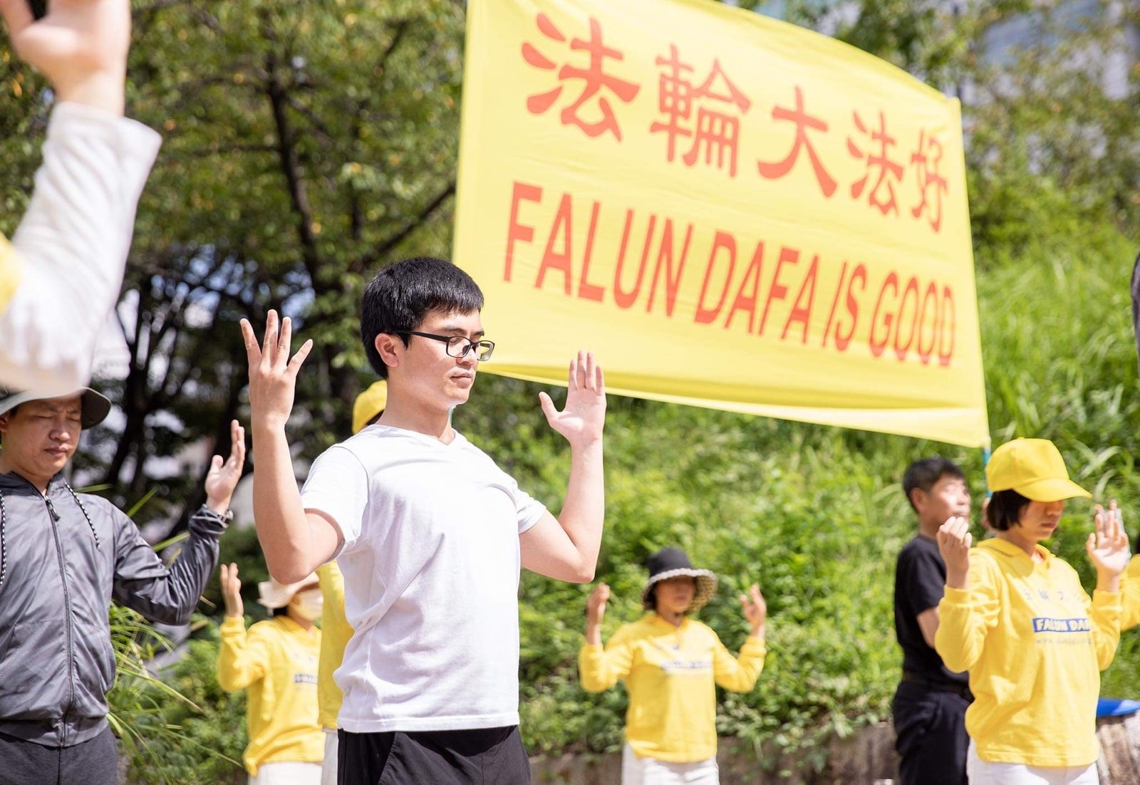 活动当天,阳光灿烂,虽然已经立秋多日,最高气温仍达三十三度,是最近六十年以来同一天创历史气温最高记录的一天。上午,法轮功学员们在荣公园集体炼功,祥和的炼功场面,吸引了过往行人。