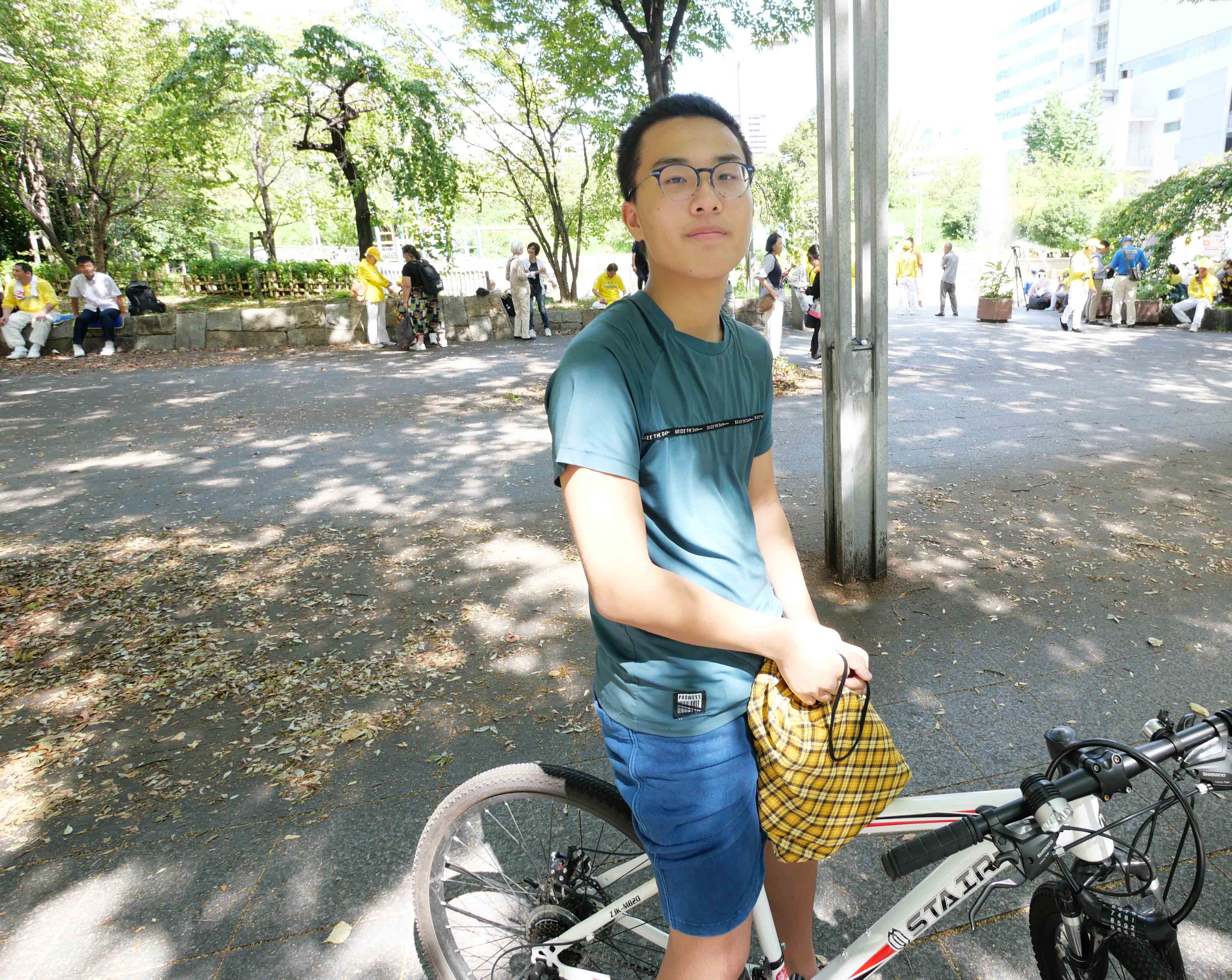 一位骑自行车的年轻人,来自新西兰。他拿到法轮大法英文简介,得知法轮大法教人按照真、善、忍原则做好人、祛病健身疗效显着后,表示很感兴趣,会上网进一步查询的。