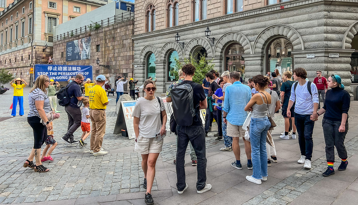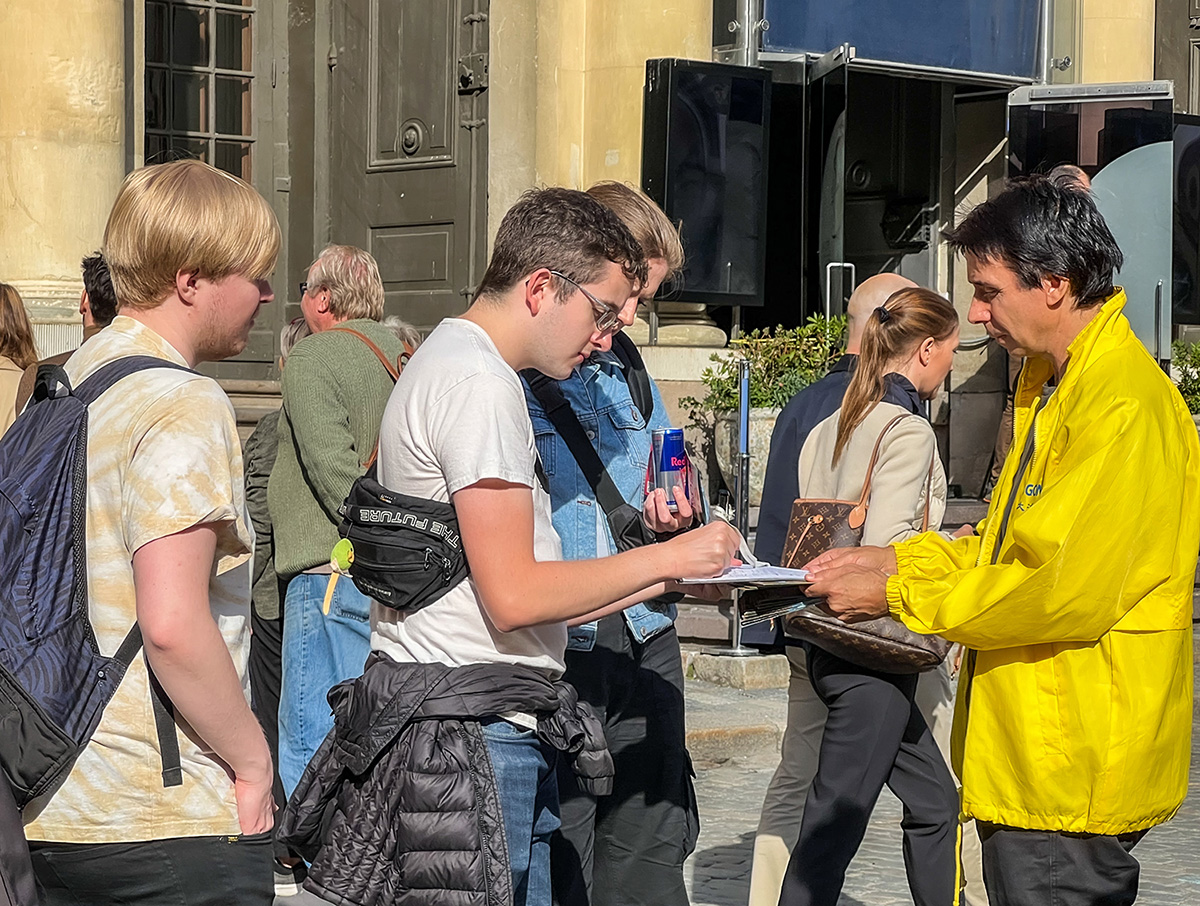 ![]() 图1:二零二三年九月十五日,法轮功学员在斯德哥尔摩王宫附近的钱币广场举办讲真相活动,征集反迫害签名。 |