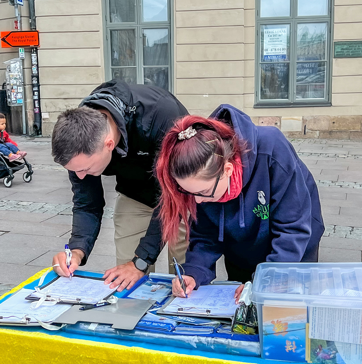 有一位瑞典中年男士,他经过学员们的活动现场时,径直就走到信息台前,拿起笔就在反迫害的征签簿上签名表示支持。他告诉学员:“我曾在欧盟工作过,法轮功在中国遭受迫害的事实真相我都知道,尤其是(中共活摘法轮功学员器官)这个恶行,必须要制止。”