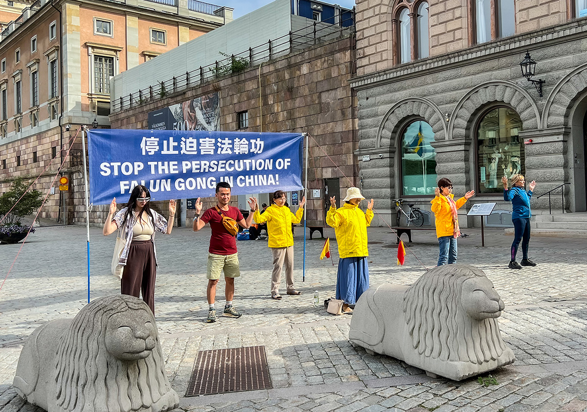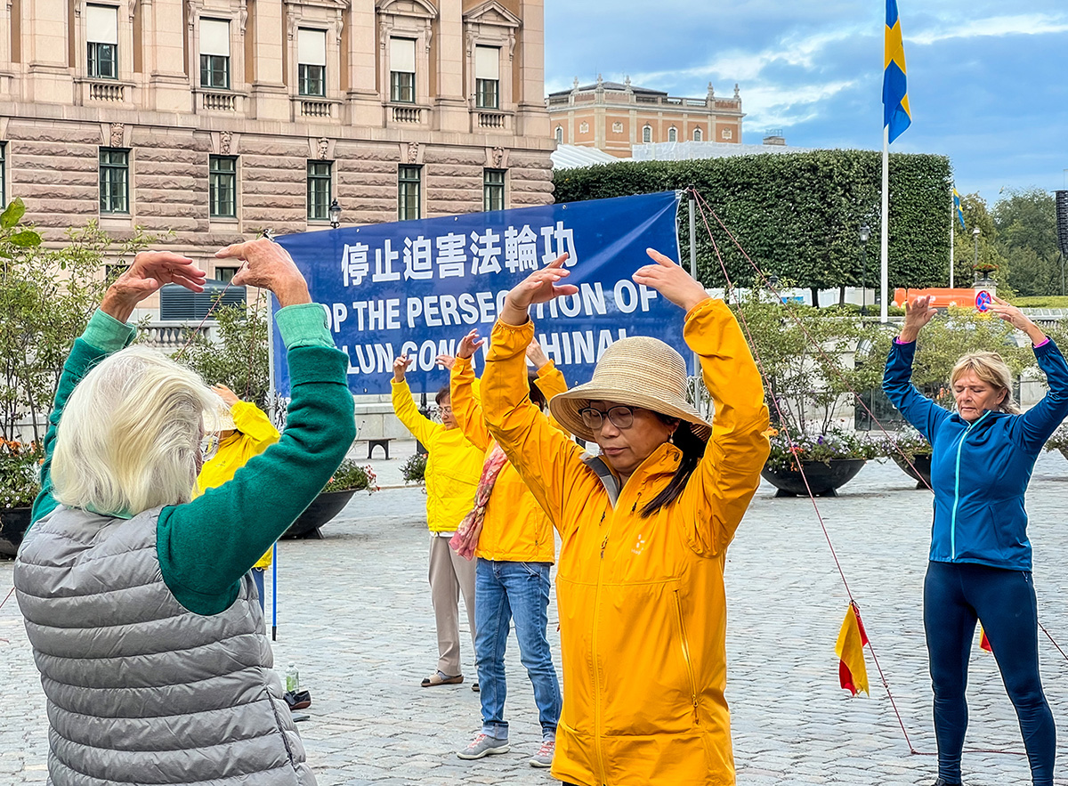 九月十五日下午,法轮功学员如往常星期五一样,在通往瑞典斯德哥尔摩王宫附近的钱币广场上设立了讲真相展位,摆放真相展板、演示法轮功的五套功法,有学员向路人讲真相,同时征集反迫害签名。