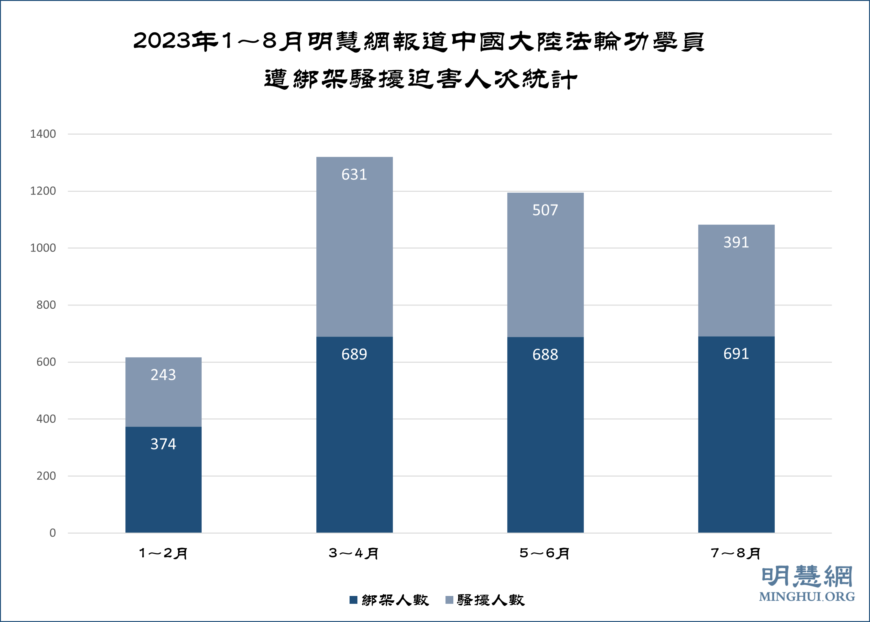 据明慧网报道统计,七至八月份获知有691名法轮功学员被绑架。