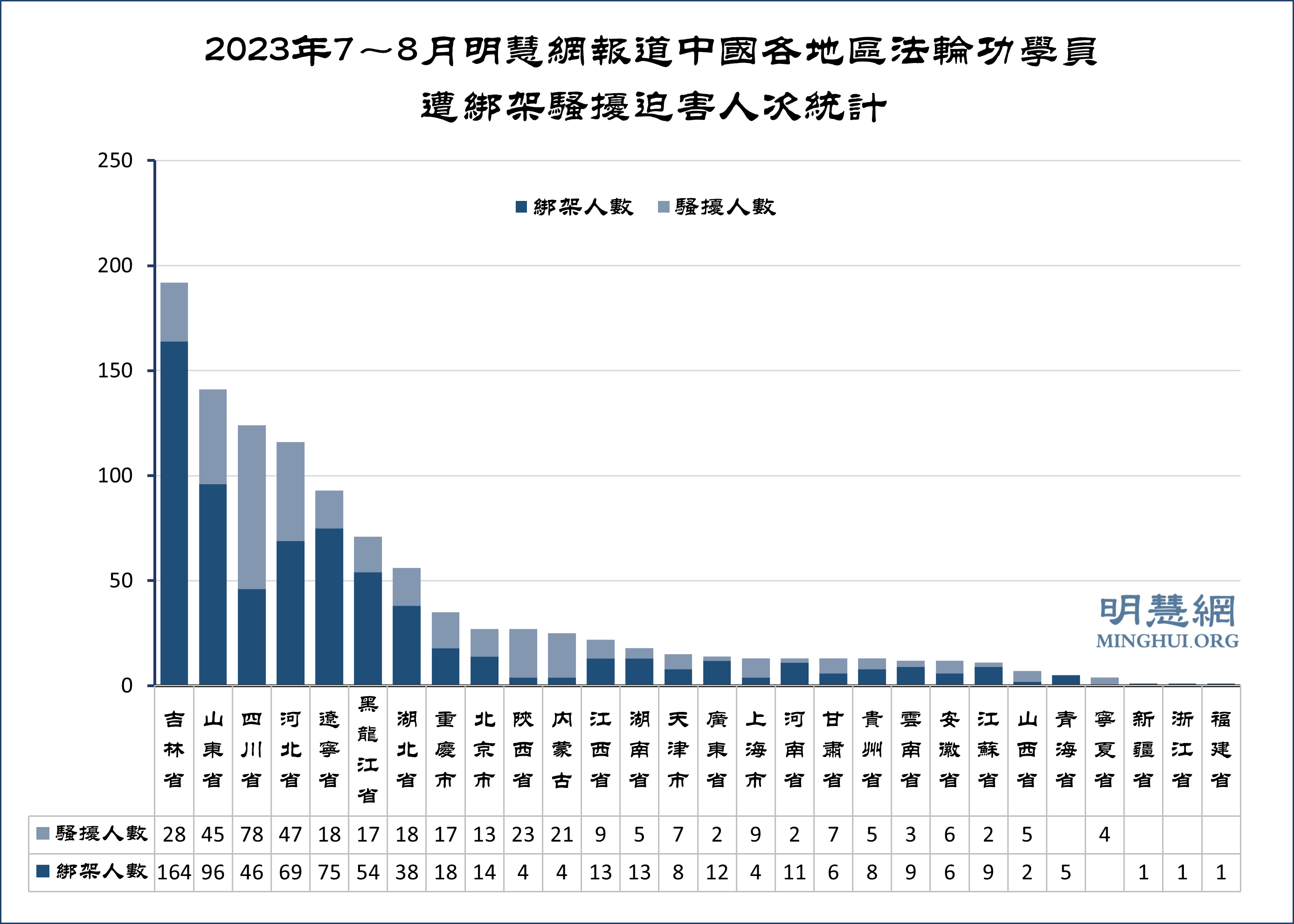 ![]() 图2:2023年7~8月明慧网报道中国各地区法轮功学员遭绑架骚扰迫害人次统计 |