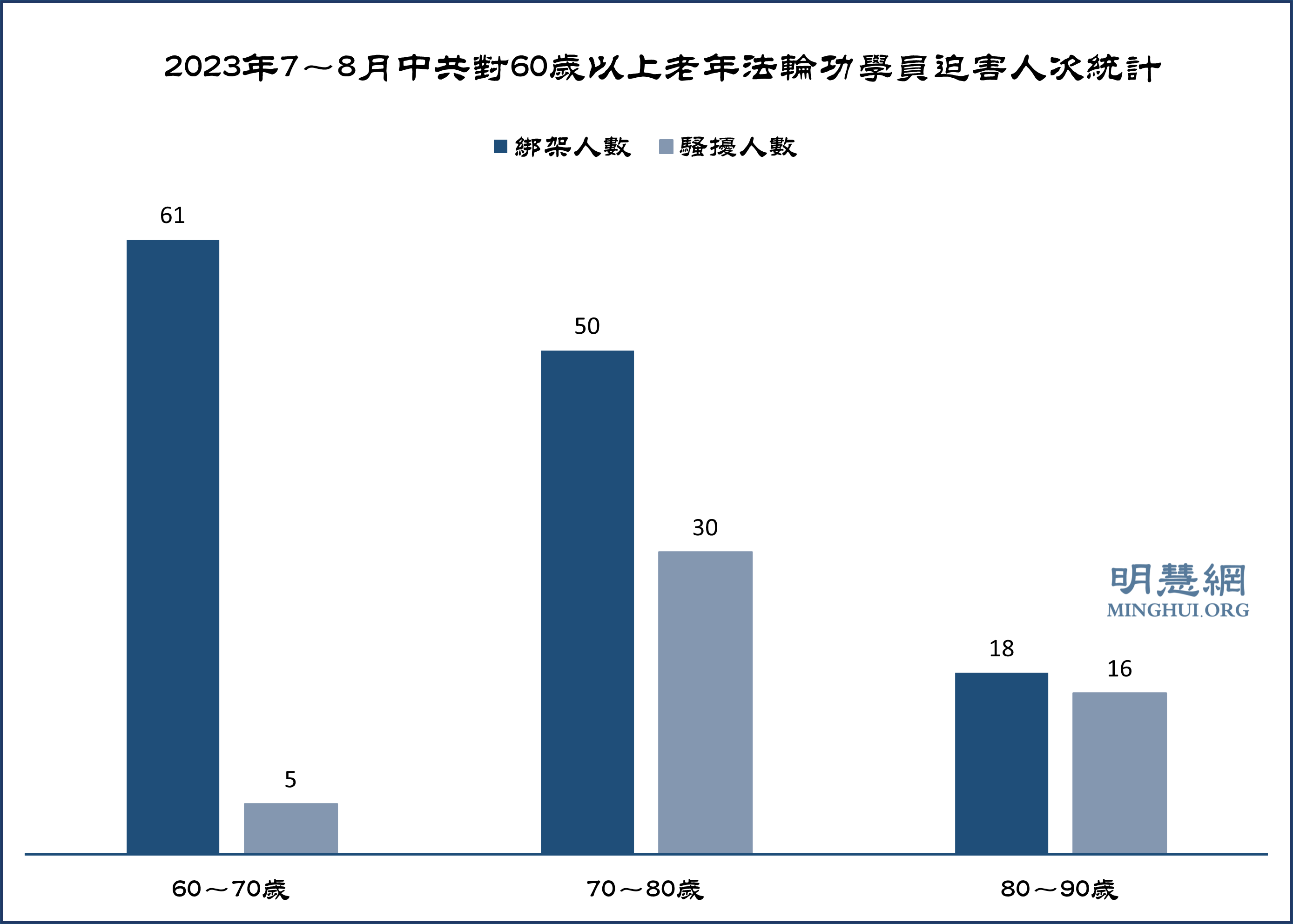 据明慧网报道,七至八月份获知有180名60岁以上老年法轮功学员被绑架骚扰,年龄最长者89岁。其中,绑架129人,80~90岁18人,70~80岁50人,60~70岁61人。骚扰51人,80~90岁16人,70~80岁30人,60~70岁5人。见图。