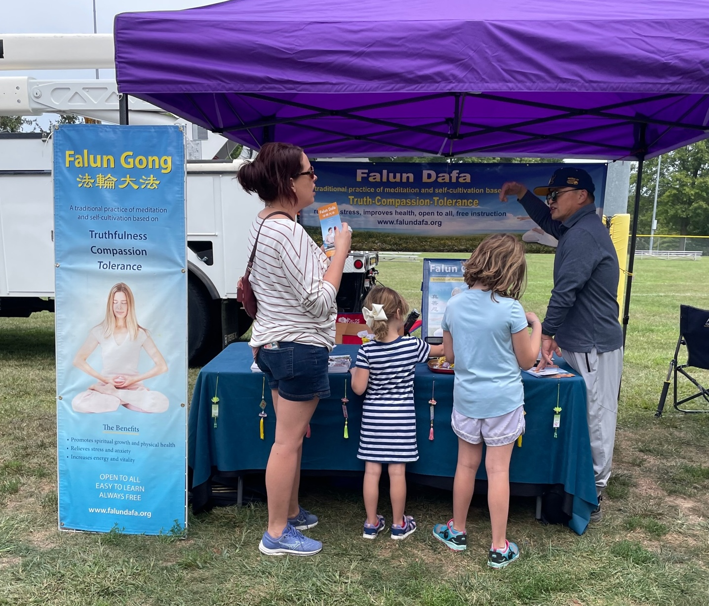 法轮功学员在展位前向人们介绍法轮功,以及中共在中国迫害法轮功学员的真相。有不少人是之前没有听说过法轮功,当他们了解到法轮功可以帮助减缓压力,使身体更健康后,纷纷表示很感兴趣,并说会好好阅读相关真相资料。学员告诉人们,可以到当地炼功点参加周末的集体炼功。