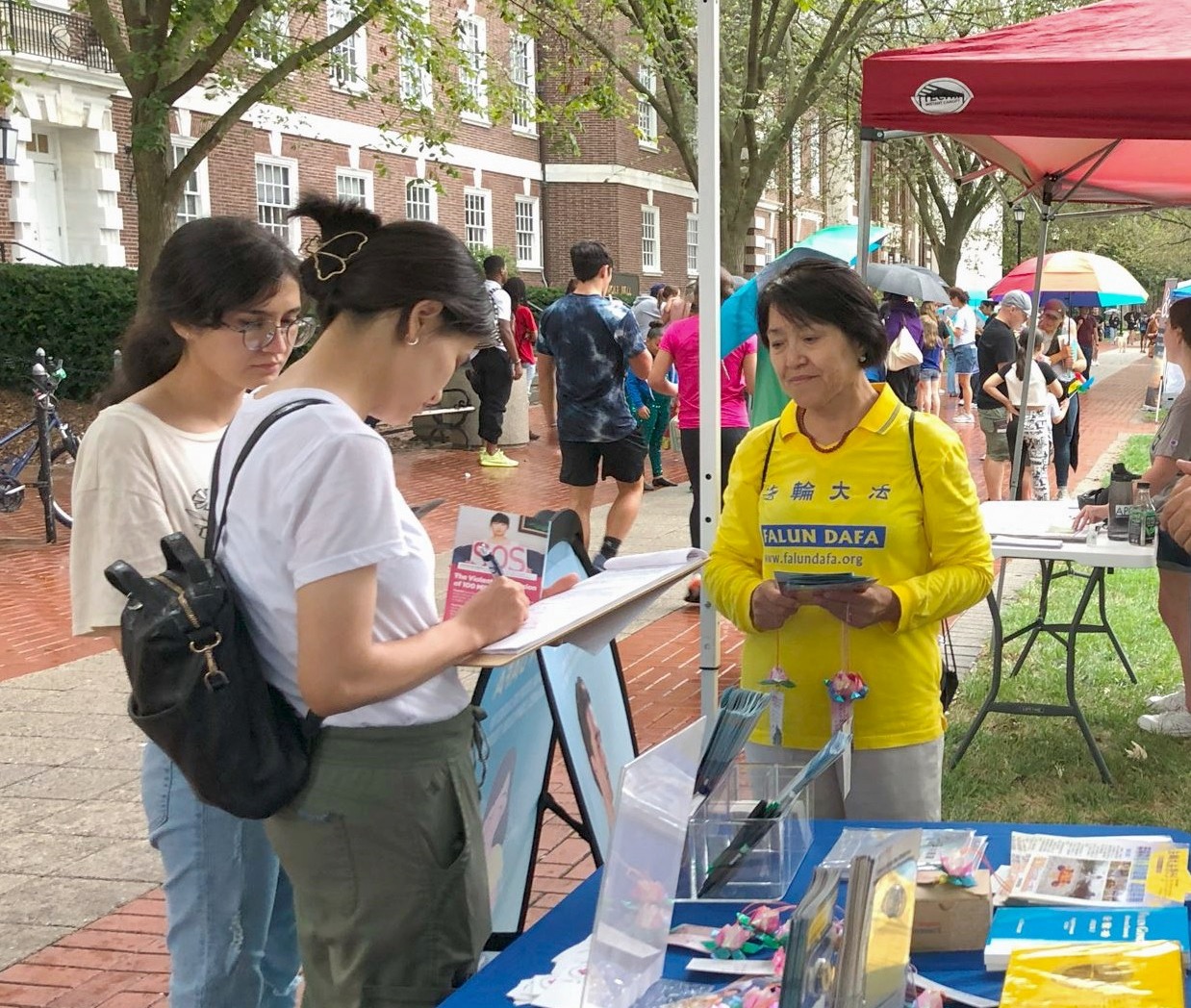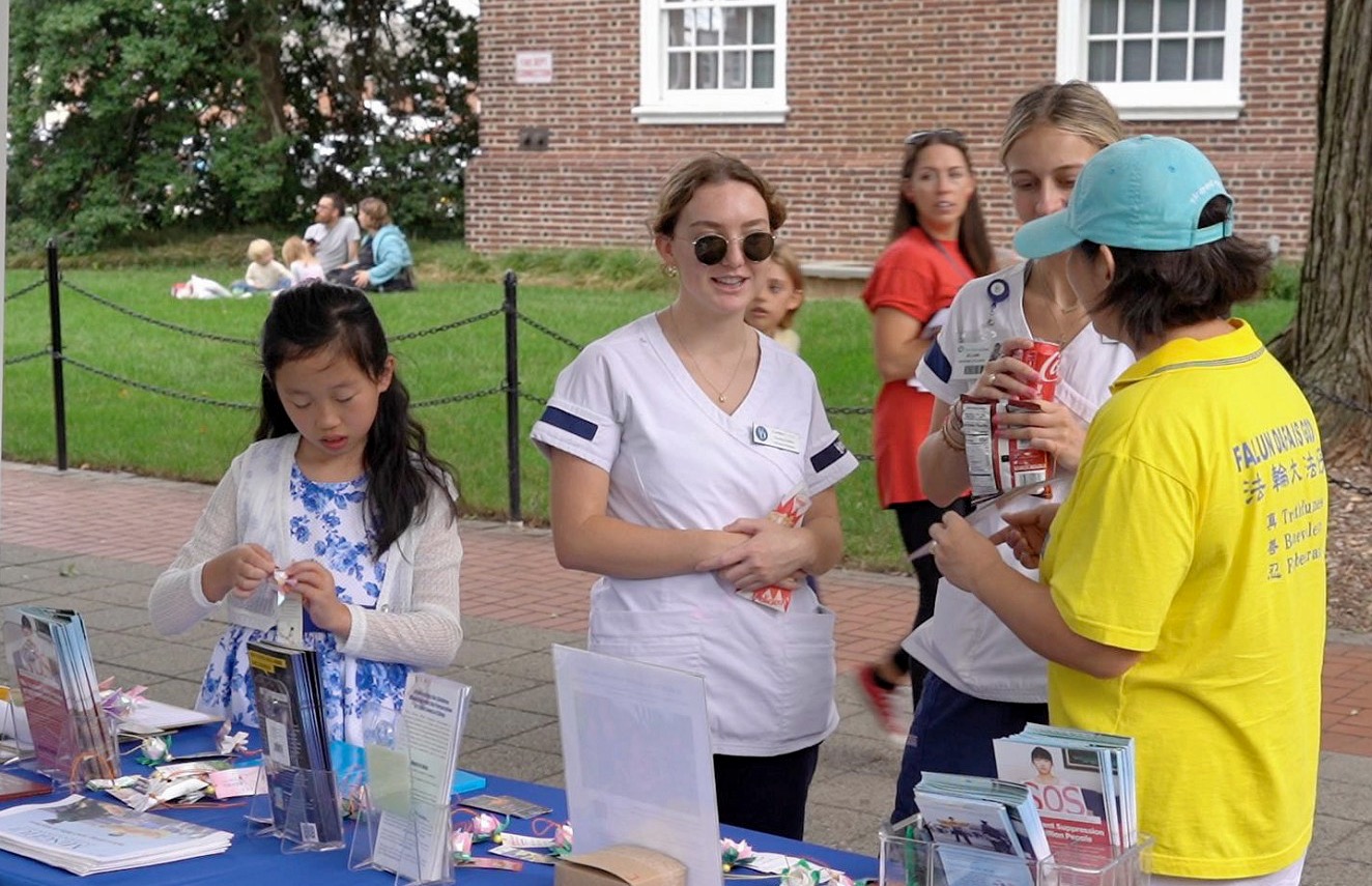 ![]() 图4~5:学员们在特拉华大学主校园举办的纽瓦克社区日活动中设立展位,向人们介绍法轮功及其真相。 |