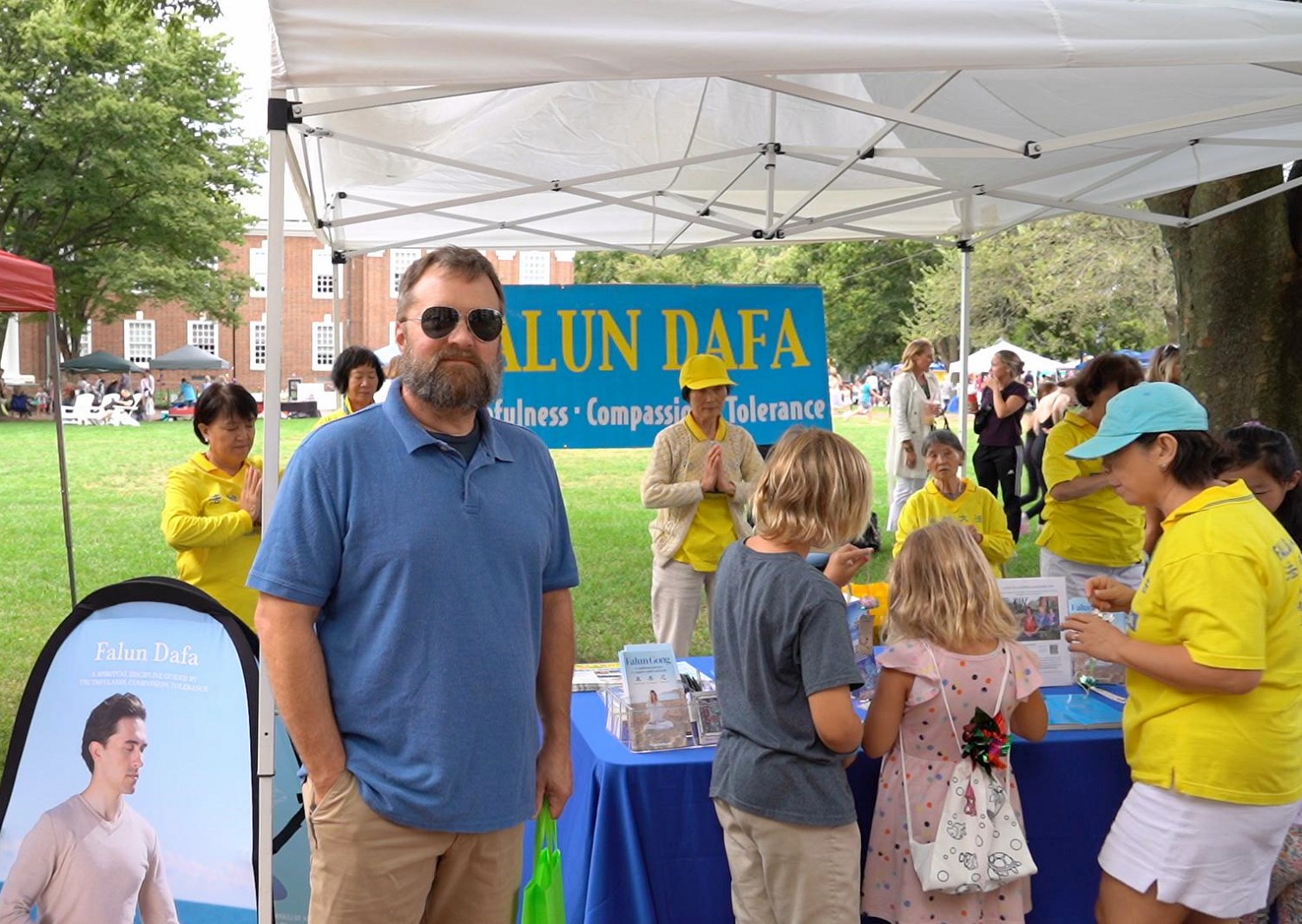 机械师罗伯·哈特曼(Rob Hartman)带着孩子们来到法轮功展位,孩子们被象征着“纯洁、美好”的小莲花吸引住了,当场跟着学折纸莲花。