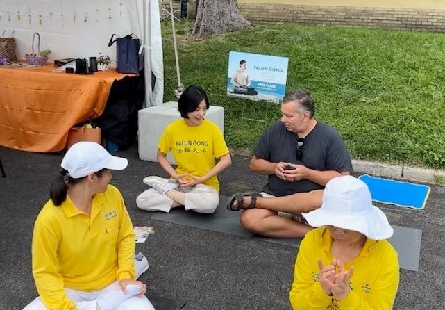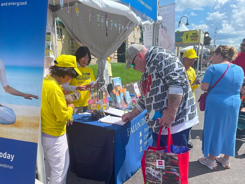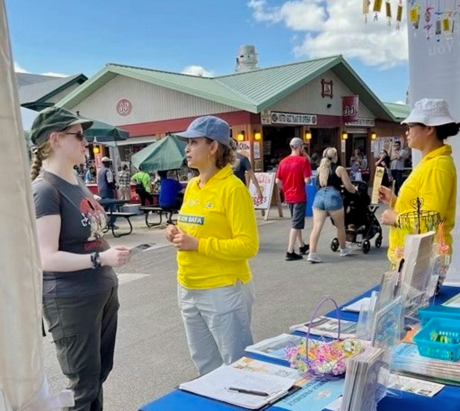 一位西人女士高兴地来到展位,说她找了一大圈终于找到了法轮功展位。原来去年她就在展位上听过真相。她在请愿书上签了名,表示要继续表达对法轮功的支持。