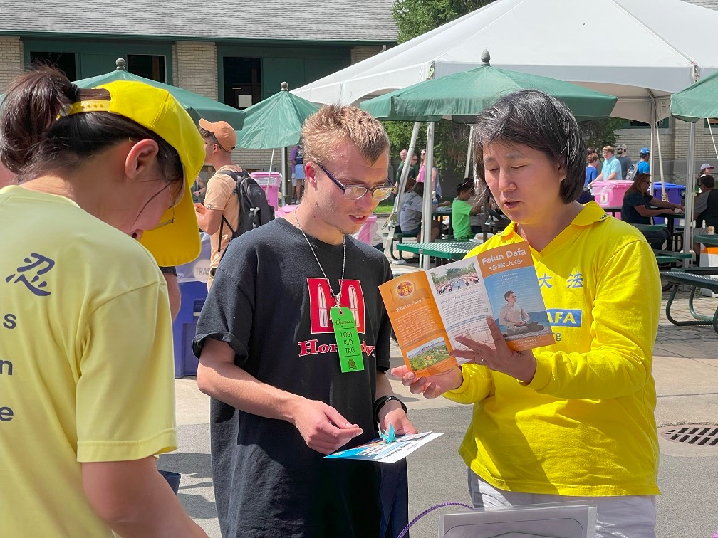 一位中年父亲和他的女儿在法轮功展台前停留了很久,他说他太太在网上教中国大陆的孩子学英文,所以他对中国现状有些了解,但还没听说过法轮功。他认真听学员讲述了法轮功强身健体的功效和中共迫害法轮功学员的情况,以及中共活摘法轮功学员器官所犯下的罪行。他表示希望自己和美国人能为在中国受难的法轮功学员做些什么。他在反迫害请愿书上签了名,拿了一份揭露中共活摘器官的真相资料,并为他的太太拿了一份《·九·评*共产党》报纸。