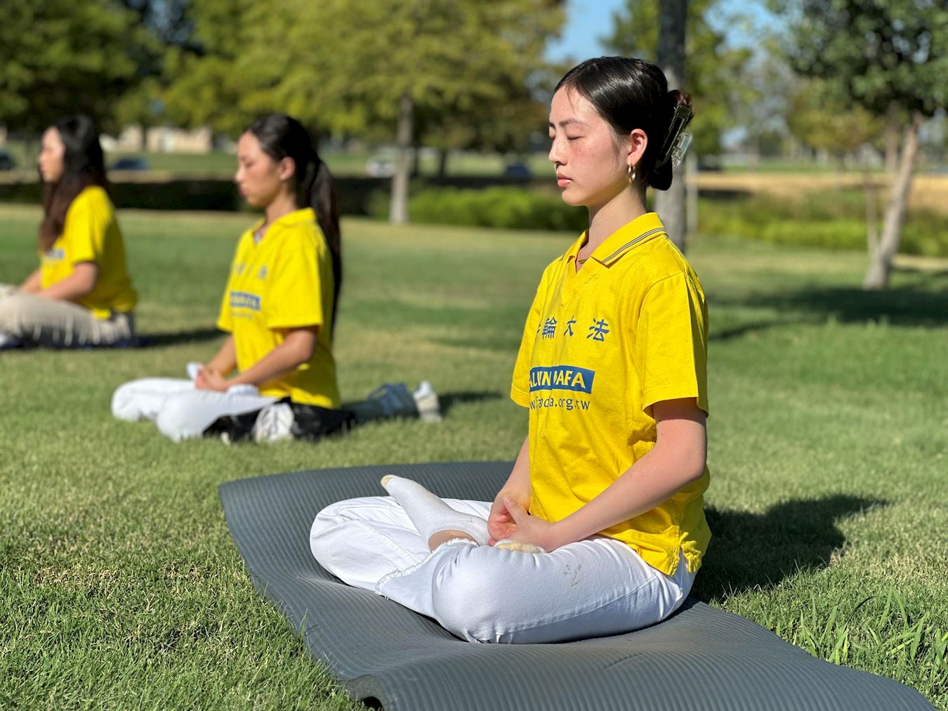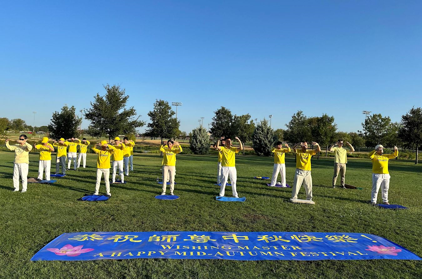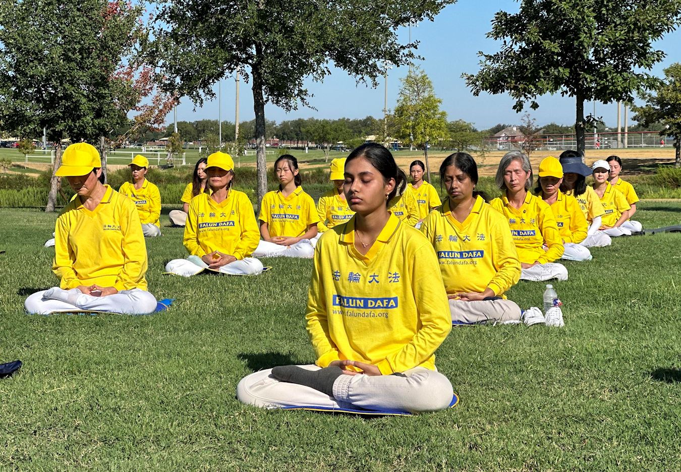 达拉斯地区刚刚经过了七、八月的高温酷热,九月中旬回落后的气温让人们感受到了初秋的来临。活动当日,天空湛蓝如画,身着黄色上衣、白色裤子的法轮功学员在凉亭旁的绿色草坪上炼五套功法,场面祥和、美好。