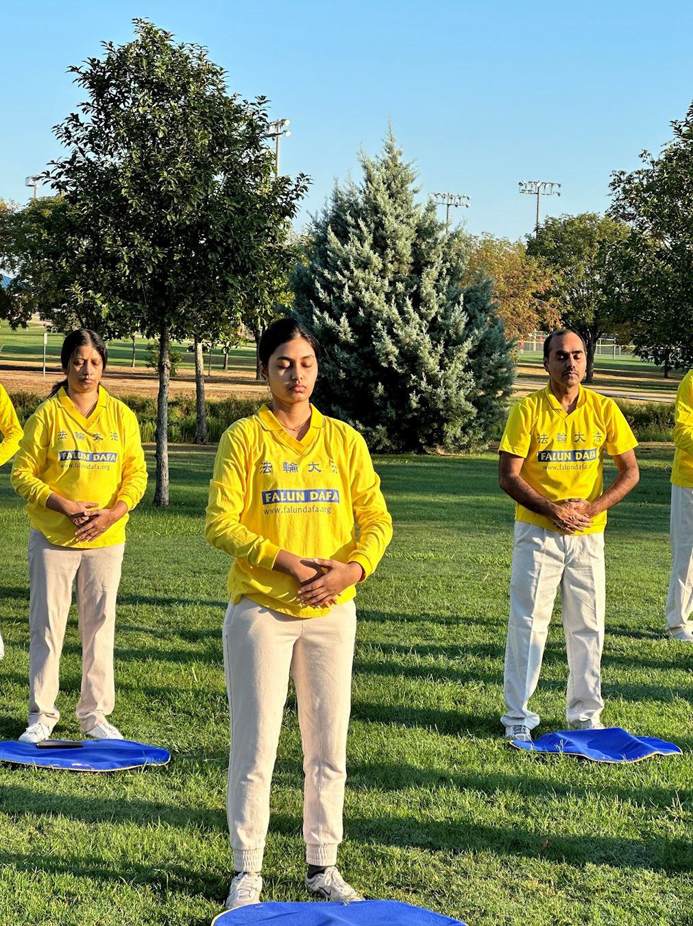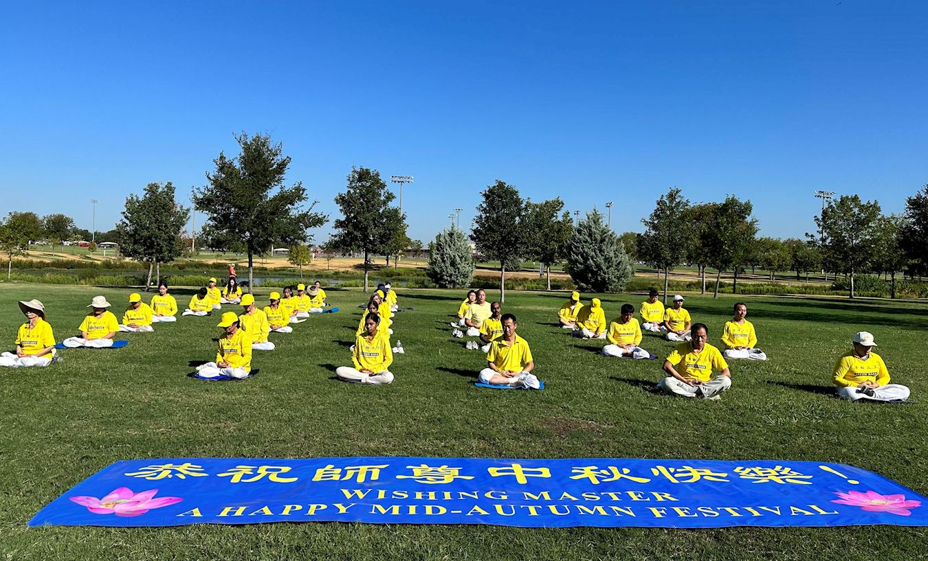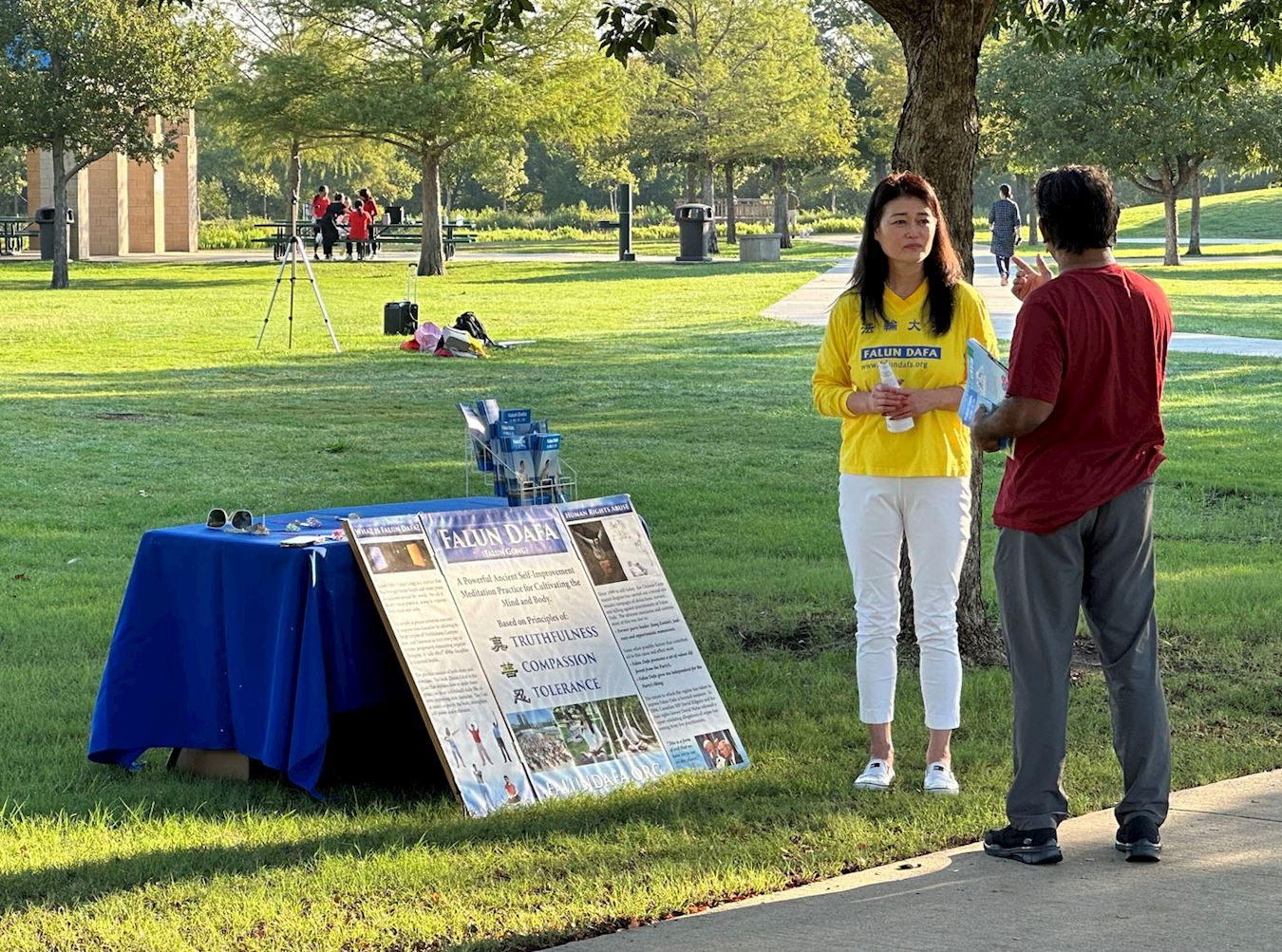 达拉斯地区刚刚经过了七、八月的高温酷热,九月中旬回落后的气温让人们感受到了初秋的来临。活动当日,天空湛蓝如画,身着黄色上衣、白色裤子的法轮功学员在凉亭旁的绿色草坪上炼五套功法,场面祥和、美好。