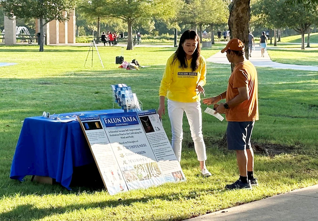 家住附近艾伦(Allen)市的西人丹先生(Dan)经常来Russell Creek公园散步、锻炼,当他看到法轮功学员炼功的情景,不禁驻足。他没听说过法轮功,但他看到学员们炼功,觉得非常棒,很想学。法轮功学员向他介绍了什么是法轮功及中国大陆对法轮功的迫害情况,Dan拿了相关信息后满意的离去。