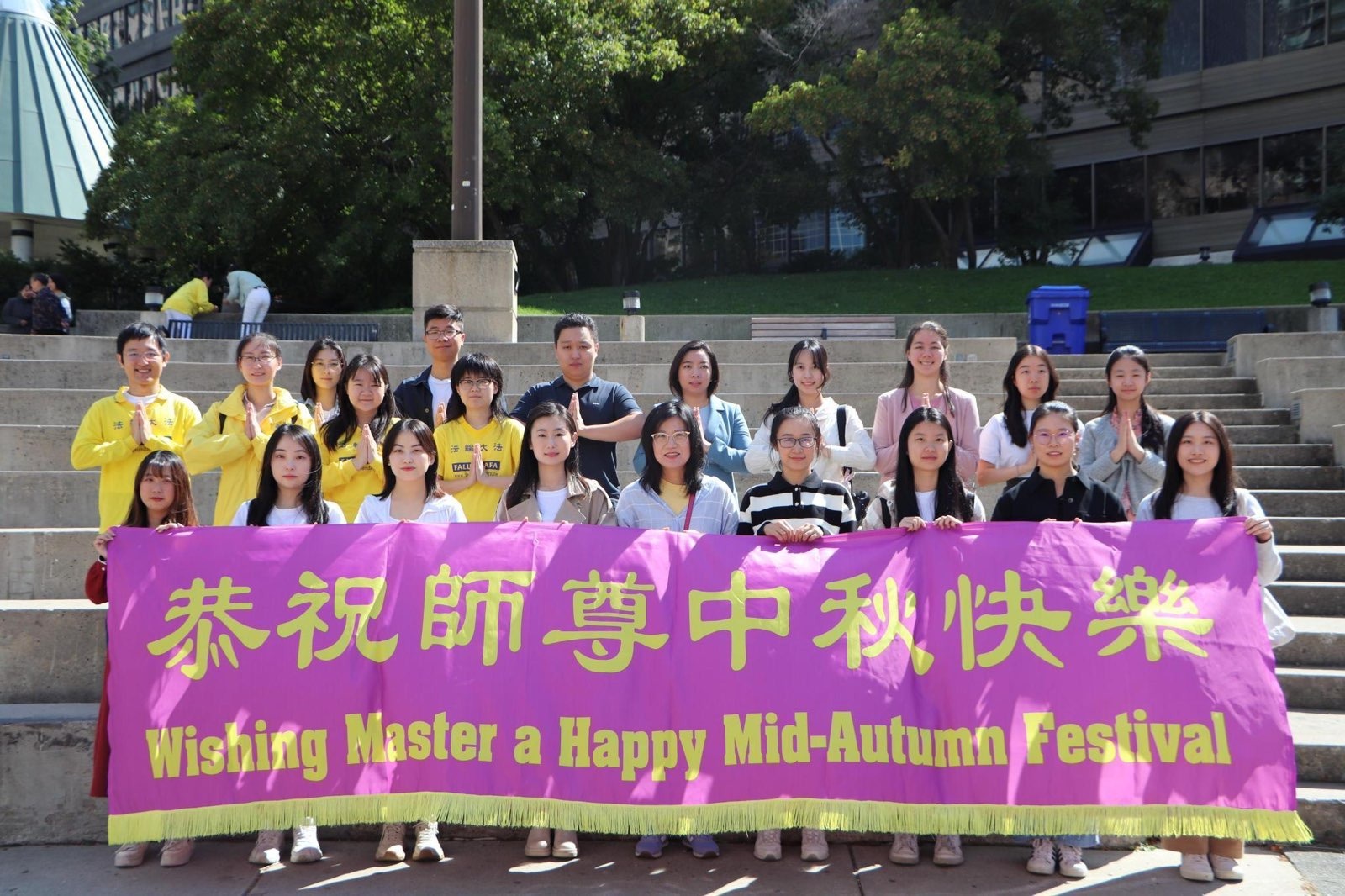 ![]() 图1:多伦多青年大法弟子恭祝师父中秋快乐! |