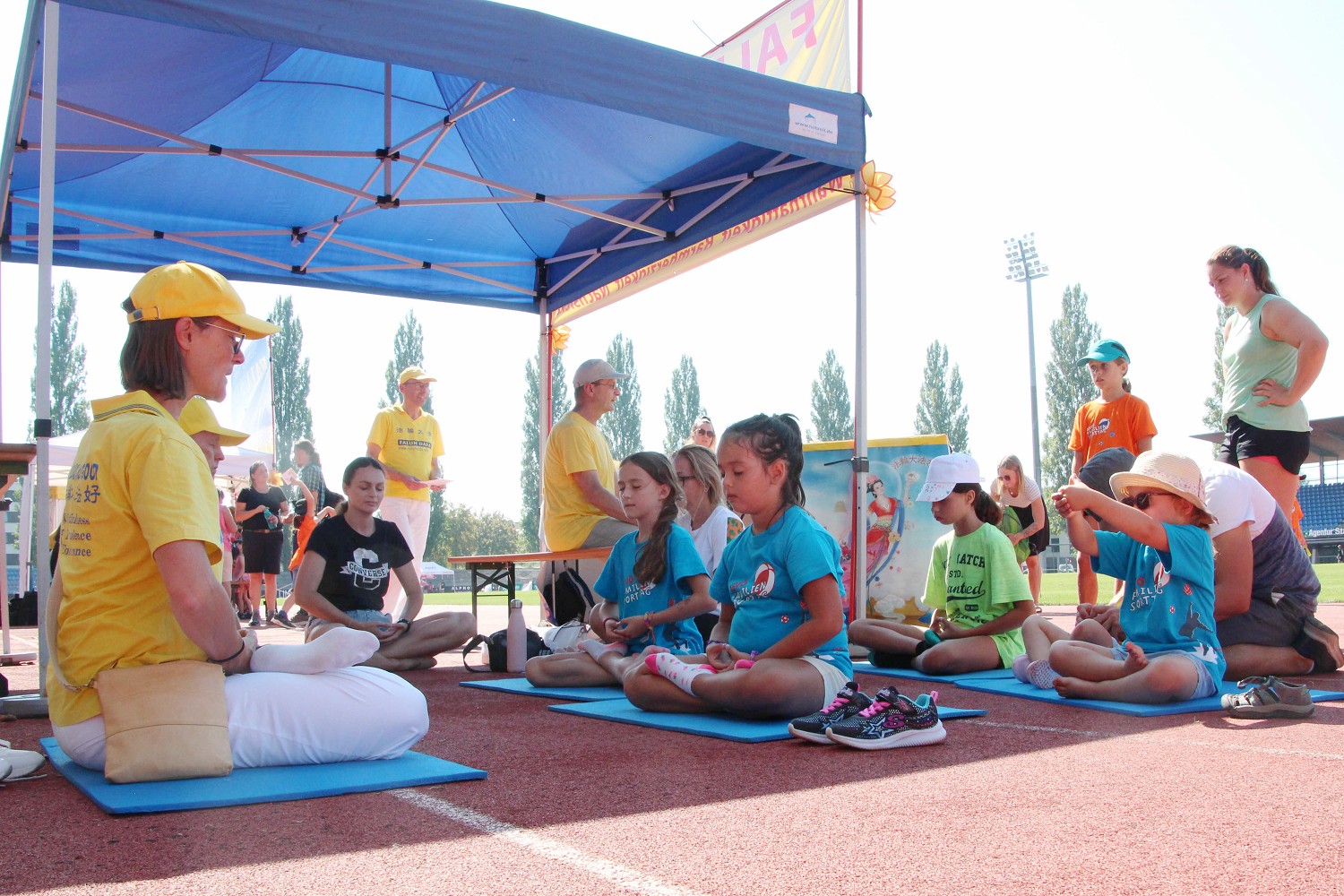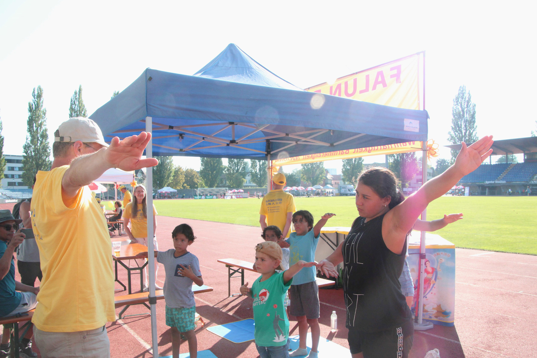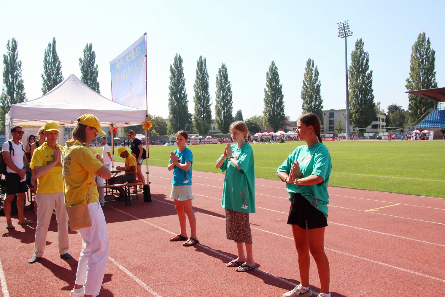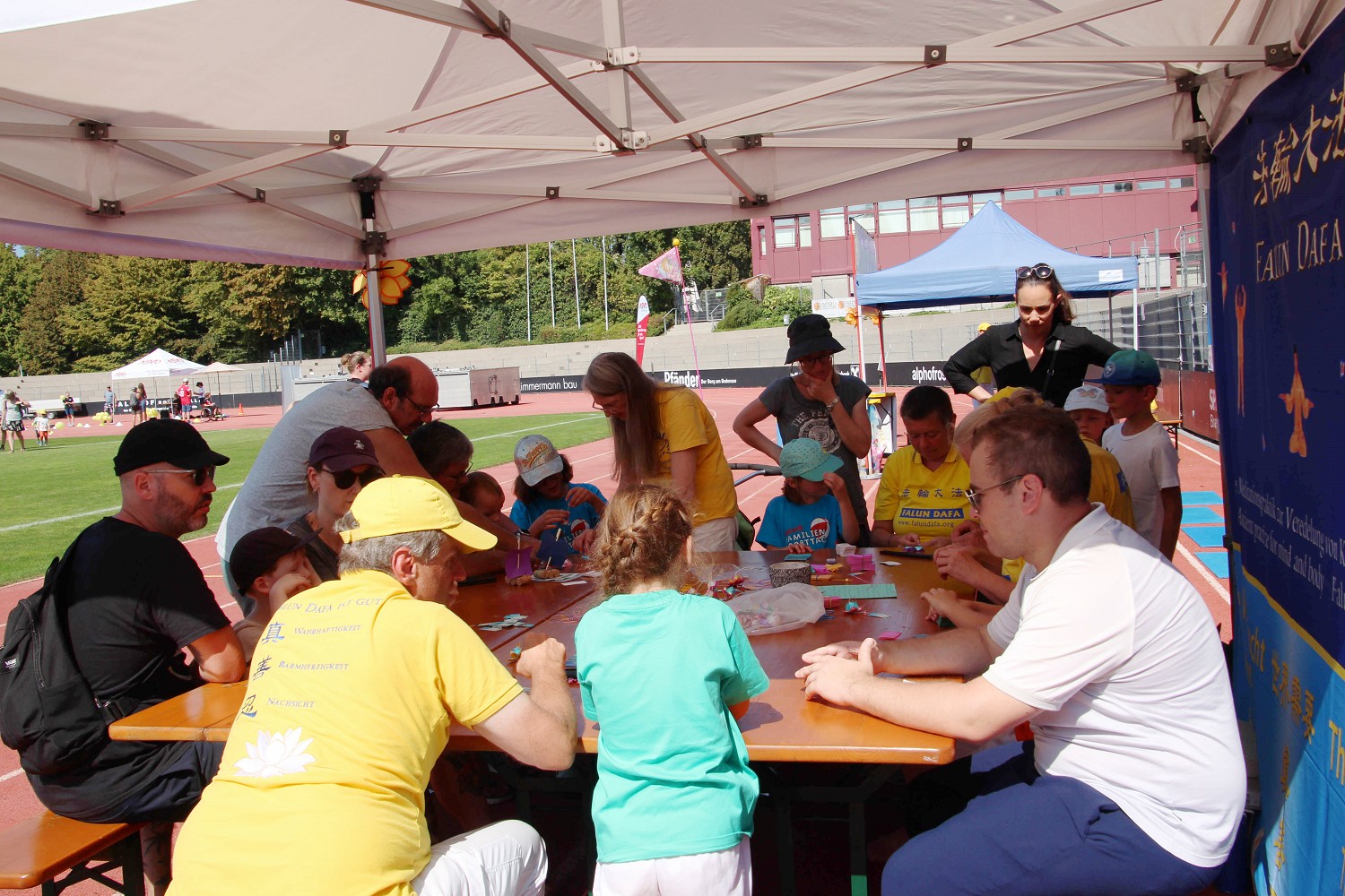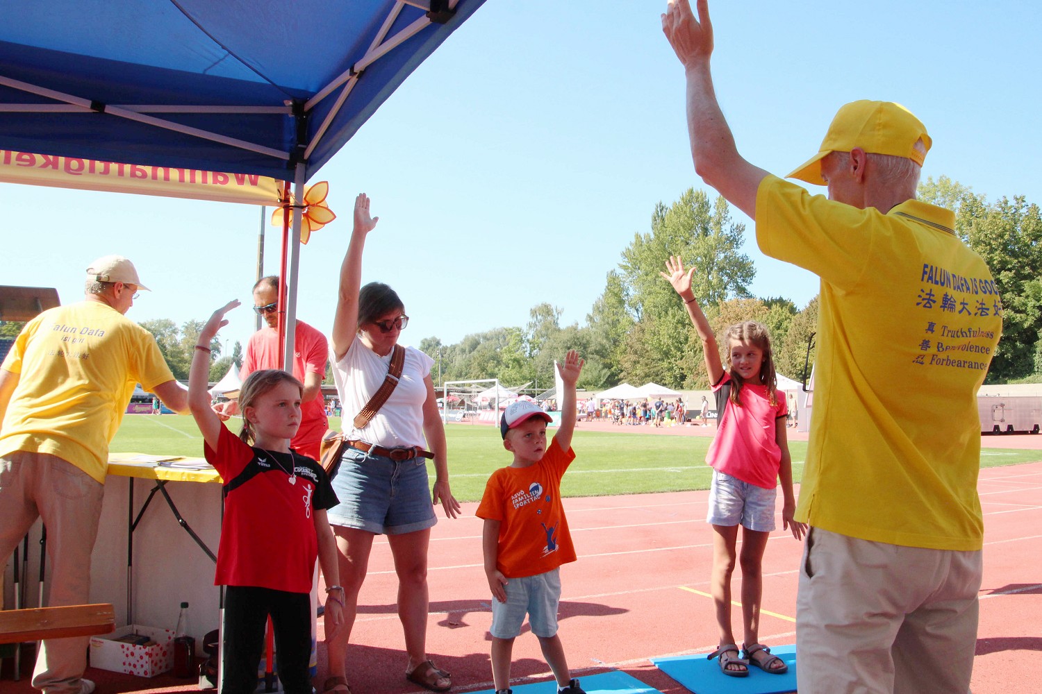 二零二三年九月十日下午,来自奥地利,德国及瑞士的法轮功学员参加了奥地利福拉尔贝格州体育总会 (ASVÖ Vorarlberg)在布雷根茨(Bregenz)举办的家庭运动日。一进入活动所在的体育场,就看到他们设立的教功和学折纸莲花的展位,吸引了很多孩子和他们的家长。很多人在学炼功法后和施拉姆一样感受到大法带来的平静与祥和。