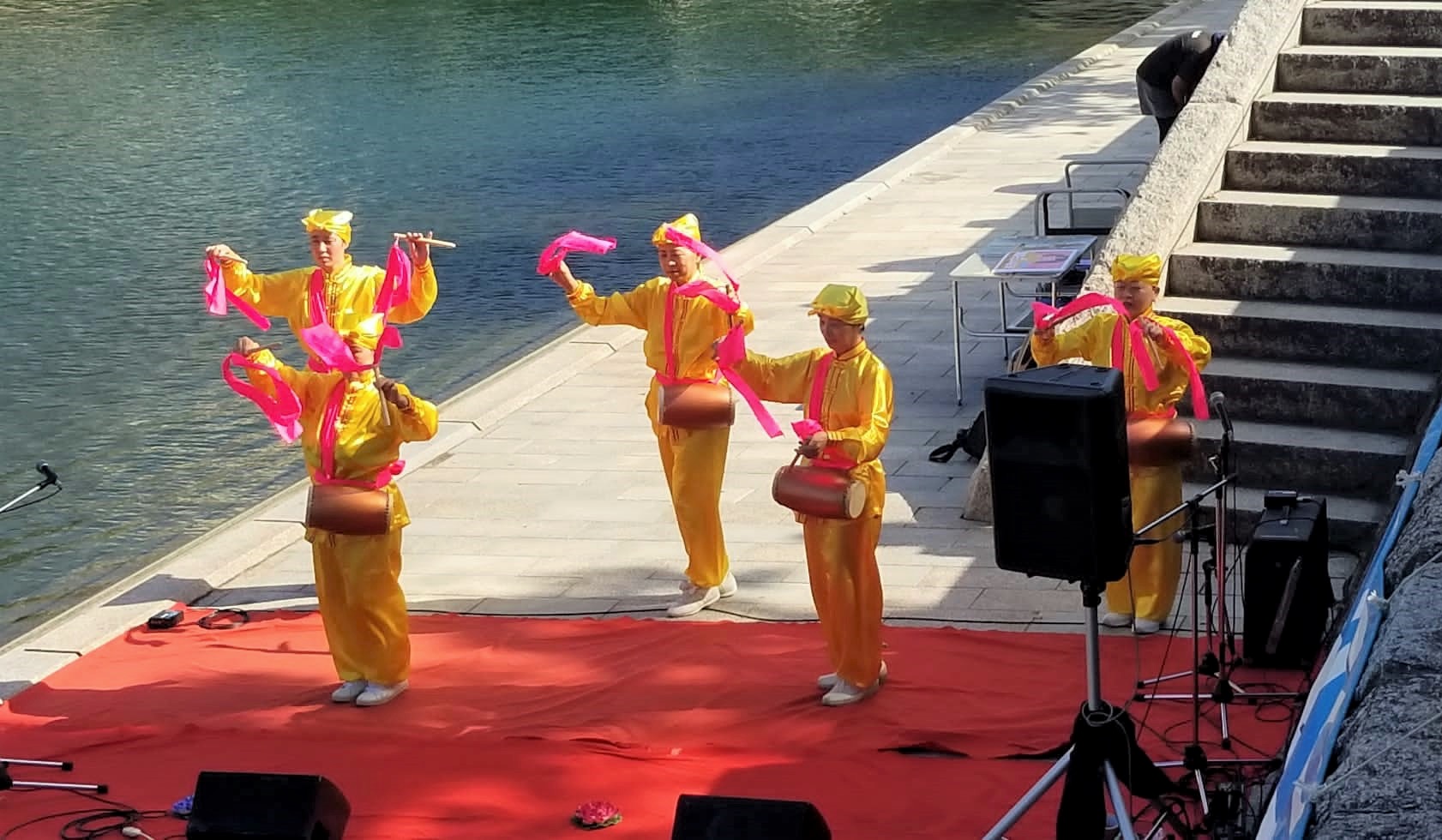 演出时,法轮功学员介绍了法轮功并演示了法轮功的五套功法动作。此外,还表演了中国的腰鼓舞“法轮大法好”、“喜庆”,二胡独奏 “得度”,配画朗读故事“了不起的米饭”。在场观众有的跟着学炼功法动作,有的拍照录像,有的接过资料阅读,对法轮功颇有兴趣。