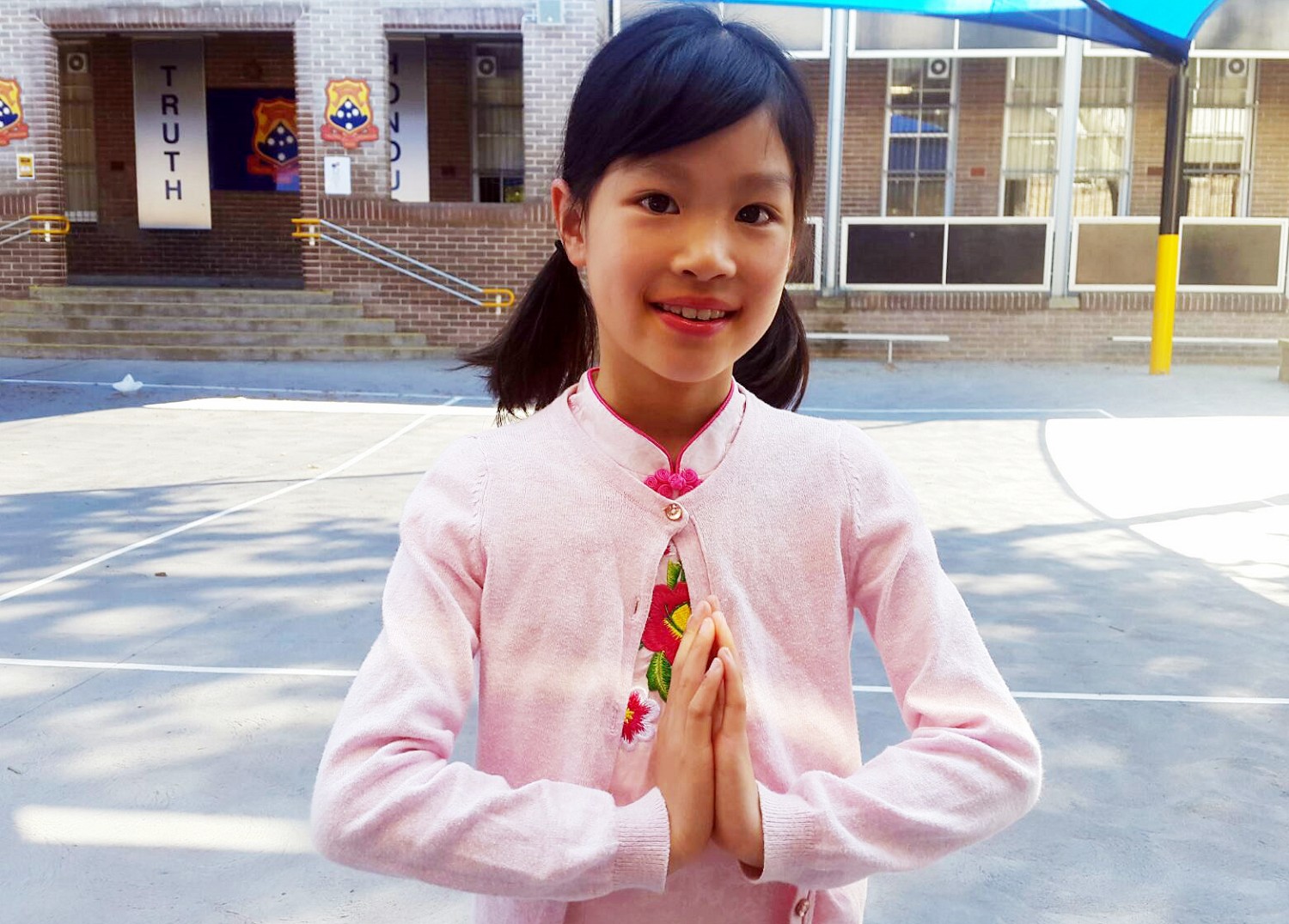 天璎还分享了今年五月参加社区弘法表演时,正经历发高烧,难受,小脸通红,化妆师和其他小朋友都以为她已经抹了腮红和唇红。因为天璎一心想参加弘法讲真相的活动,助师正法,她说:“表演一开始我就一点都不难受了,我很感谢师父的加持。”