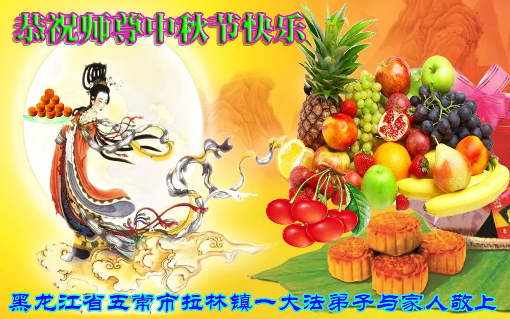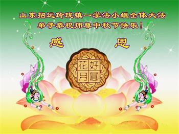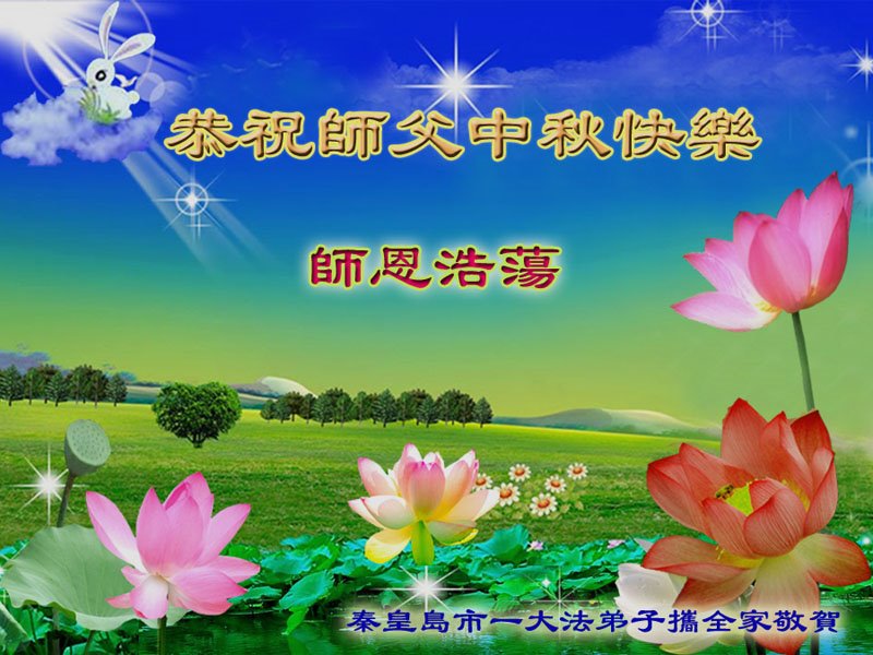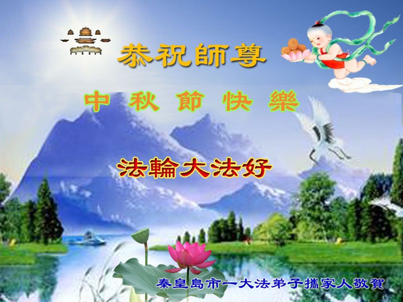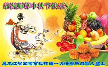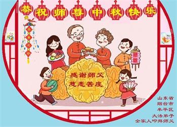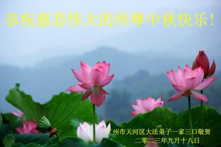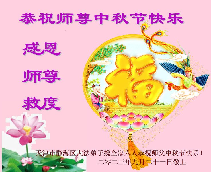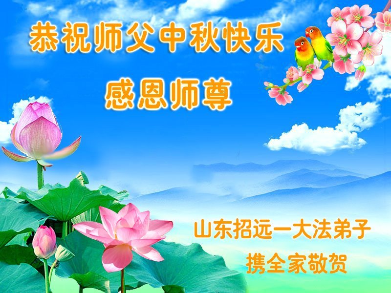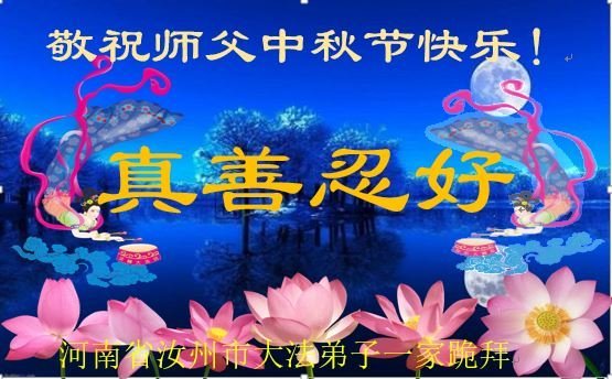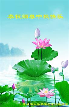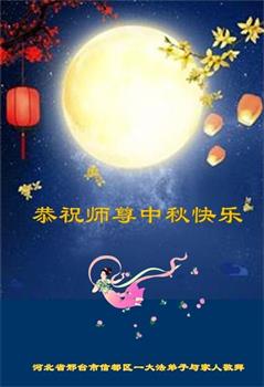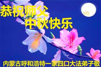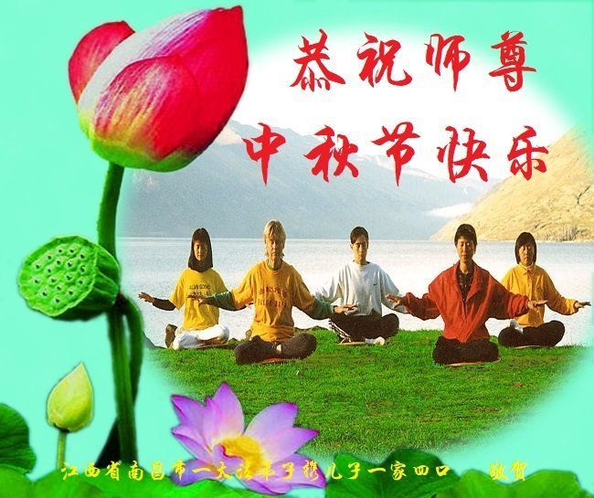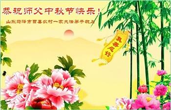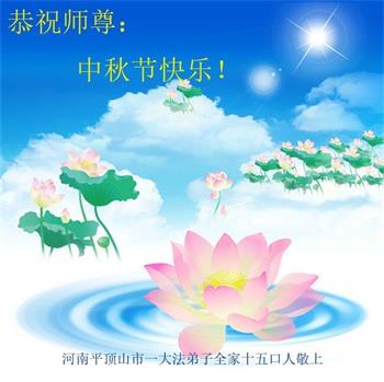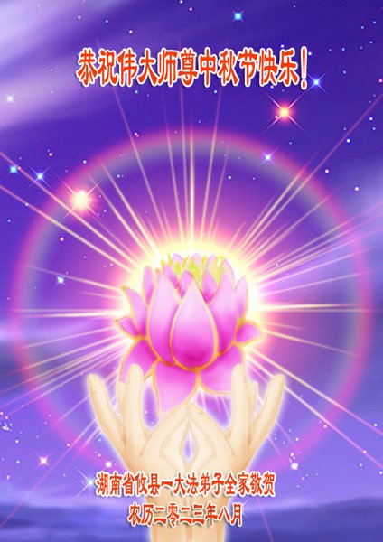 我们家还没有修炼法轮功,但是,我们全家人都知道法轮功是个好功,是教人做个好人,能使身体健康无病的。我们亲戚有炼法轮功的,邻居也有炼的。他们修炼后,变化都很大,是大家公认的好人。这些年,打压这么厉害的情况下,他们不怕死,不怕抓,仍然坚定的修炼法轮功,我们从心里佩服,现在社会上这样的人不多。都是李大师好,才能教育出这么些好徒弟。这些年,因为我们相信法轮功好,帮助法轮功学员躲避迫害,也得到李大师的保护,全家老少身心健康,工作顺利,生活的幸福快乐!我们从心里感谢李大师的恩情。我们全家人恭祝李大师中秋节快乐!李大师您辛苦了!