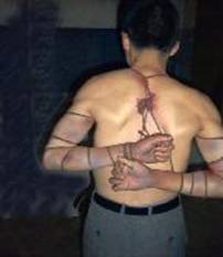 陈国祥刚被绑架到劳教所大厅,就被警察用螺纹钢猛击头部,致使其当时就昏倒在地,不省人事。之后又历经十七个昼夜的“熬鹰”折磨,一闭眼,就有包夹拿针扎、用手掐等,遭受“上绳”酷刑折磨,当提至极限痛的昏死过去才放下,如此反复数次;还遭包夹毒打,用拳头打脸,用脚猛踹腰部,使其几近休克。