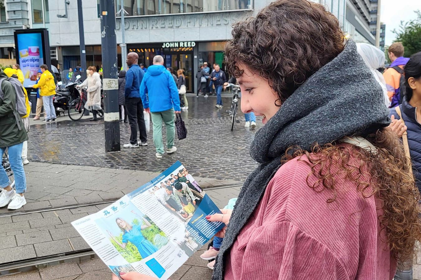 看着法轮功学员的游行队伍,在大学教授哲学课程的玛洛斯·范德波尔(Marloes van de Pol)用手机记录了游行场面。她从横幅中了解到,中共在迫害法轮功学员,她哽咽地说道:“迫害真是太糟糕了,那些人(法轮功学员)不该被迫害。”当她进一步了解到在过去的二十多年里,法轮功学员为坚守信仰,通过各种方式反迫害,她认为:“越多的人知道(真相),会有越多的人伸出援手(制止迫害)。”