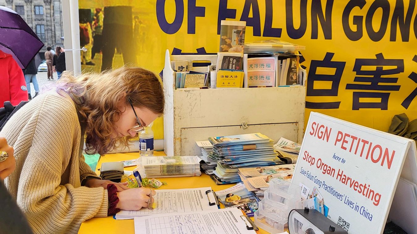 水坝广场上展版上的讯息,让来自汉堡的塞德里克(Cedric)和朱莉娅·埃格(Julia Egge)想起在自己的城市看到过法轮功学员的活动。他们停下脚步,签名制止迫害。